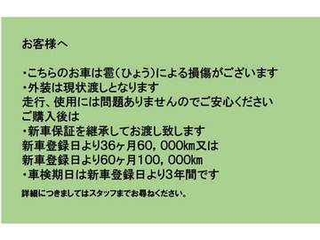 こちらの車両はひょう害車となります。新車保証はありません。軽微な凹みがありますが走行に問題はございません。店頭にて現車を確認いただきましてからのみの販売とな...