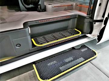 日産純正ナビゲーションMM520D-Lが装着されてます。セカンドスライドアップシート/ロングステップ/ステップイルミネーションが装着されてます。