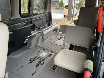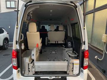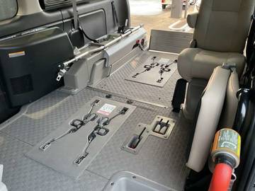簡単な操作だけで昇降するリフターを装備。安心してご使用いただけます。車いす4名仕様 5ナンバー幅で車いす4名乗車ができる。セカンドシートを展開すれば車いす2名+8名