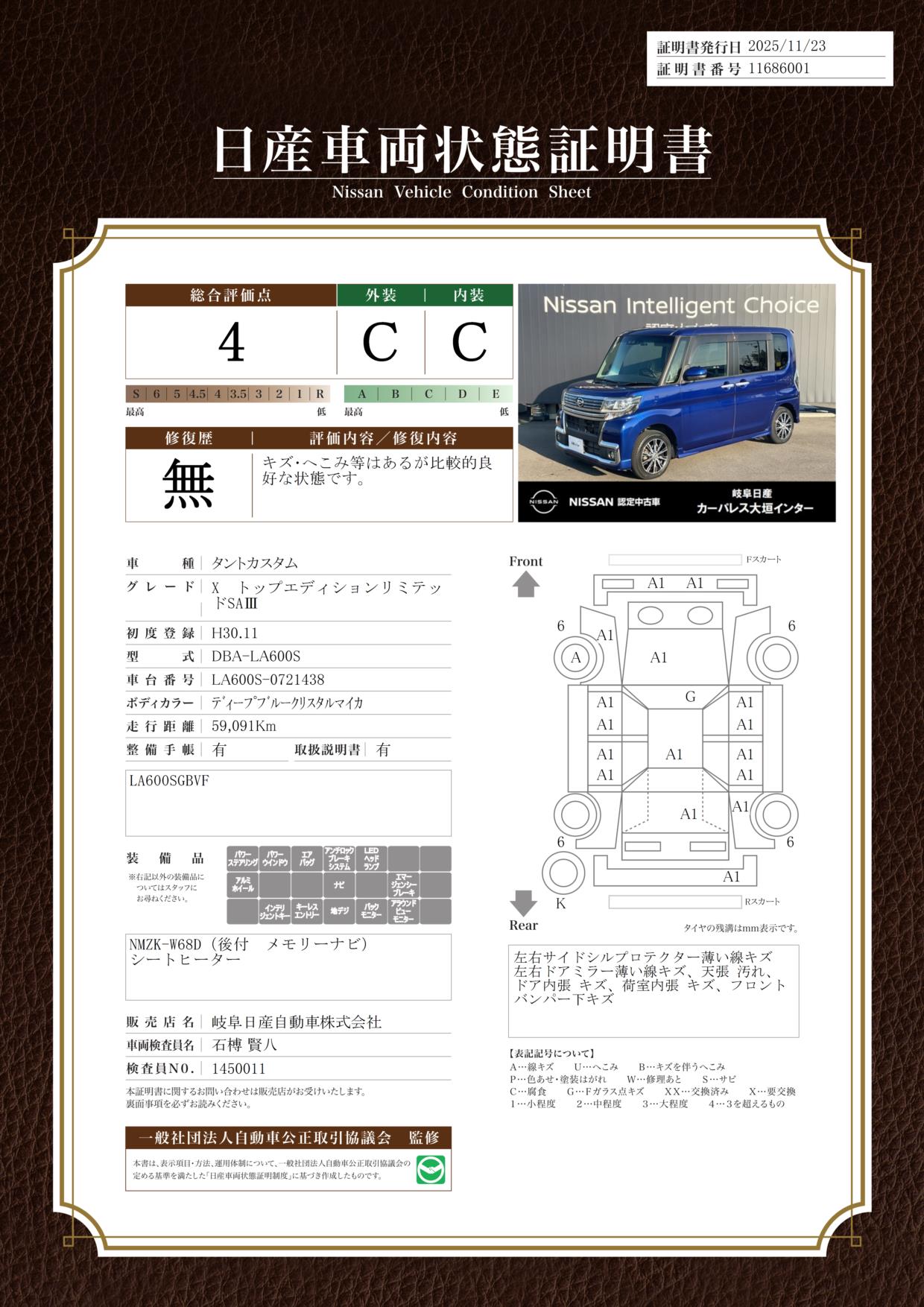 評価機関 : 日産車両状態証明