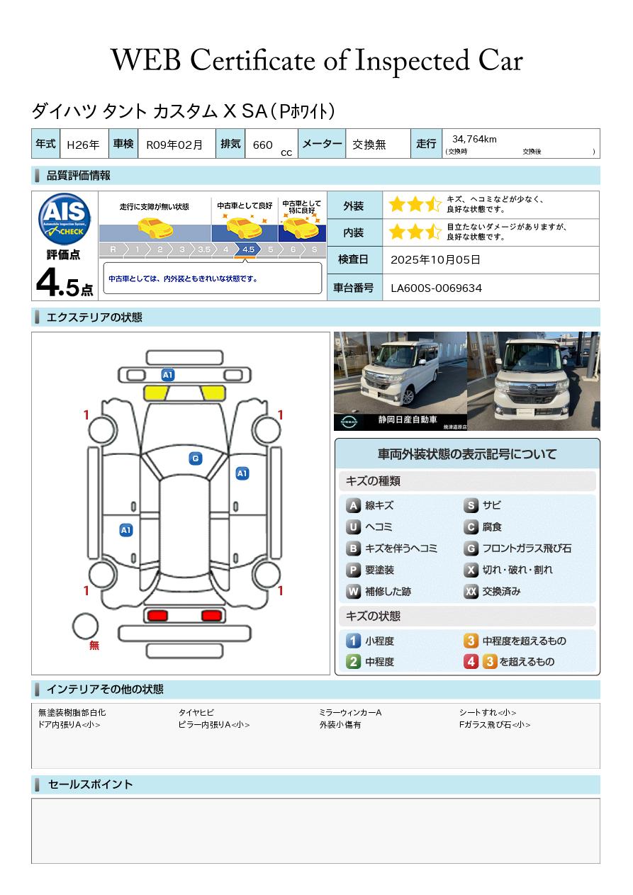 評価点イメージ : 中古車としては、内外装ともきれいな状態です。