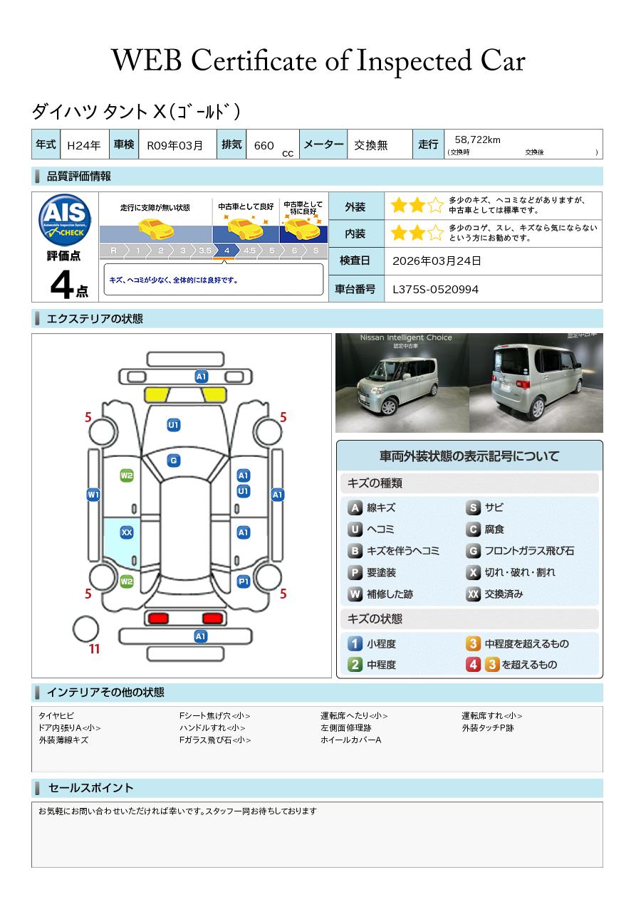 現状括弧書き内の年月まで車検有効期限が残っていますが、ご成約時に新しく車検を取り直します。なお取り直しの費用は車両価格に含まれています。