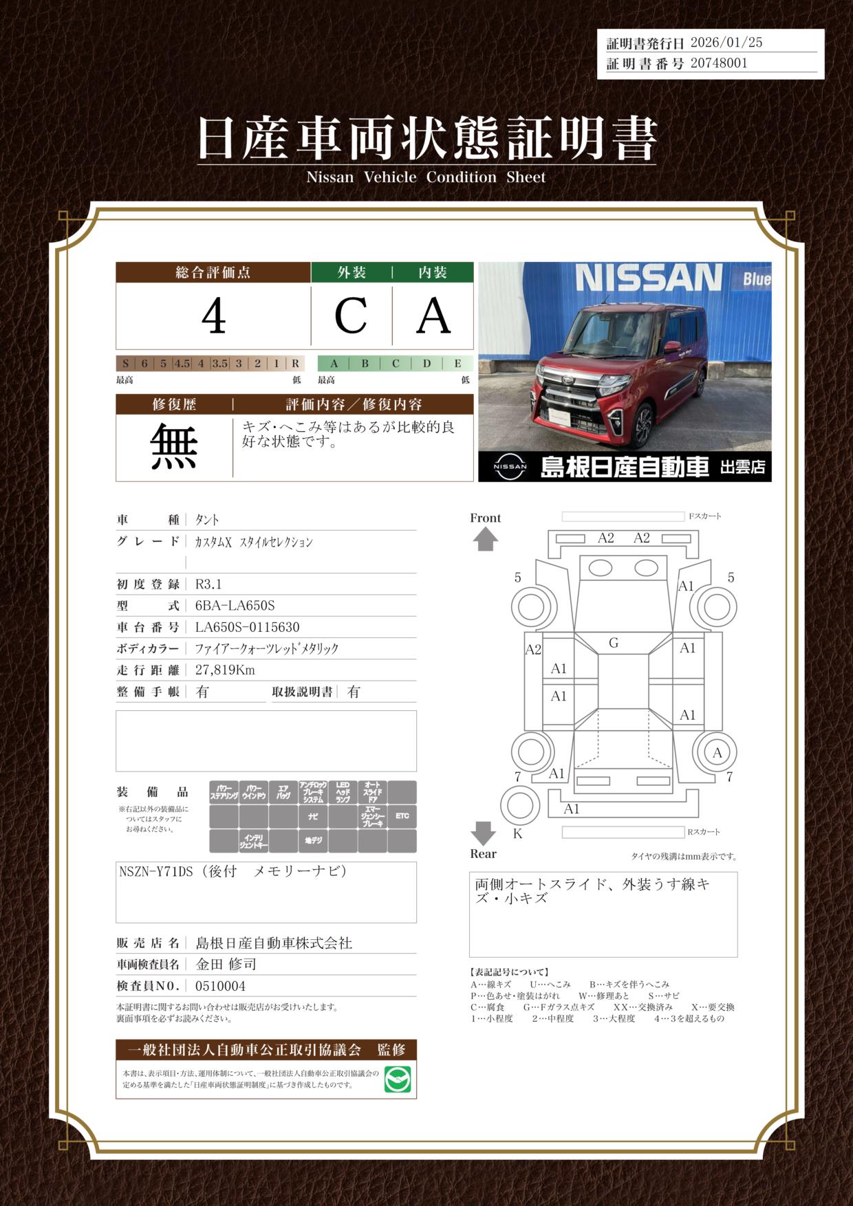 評価機関 : 日産車両状態証明