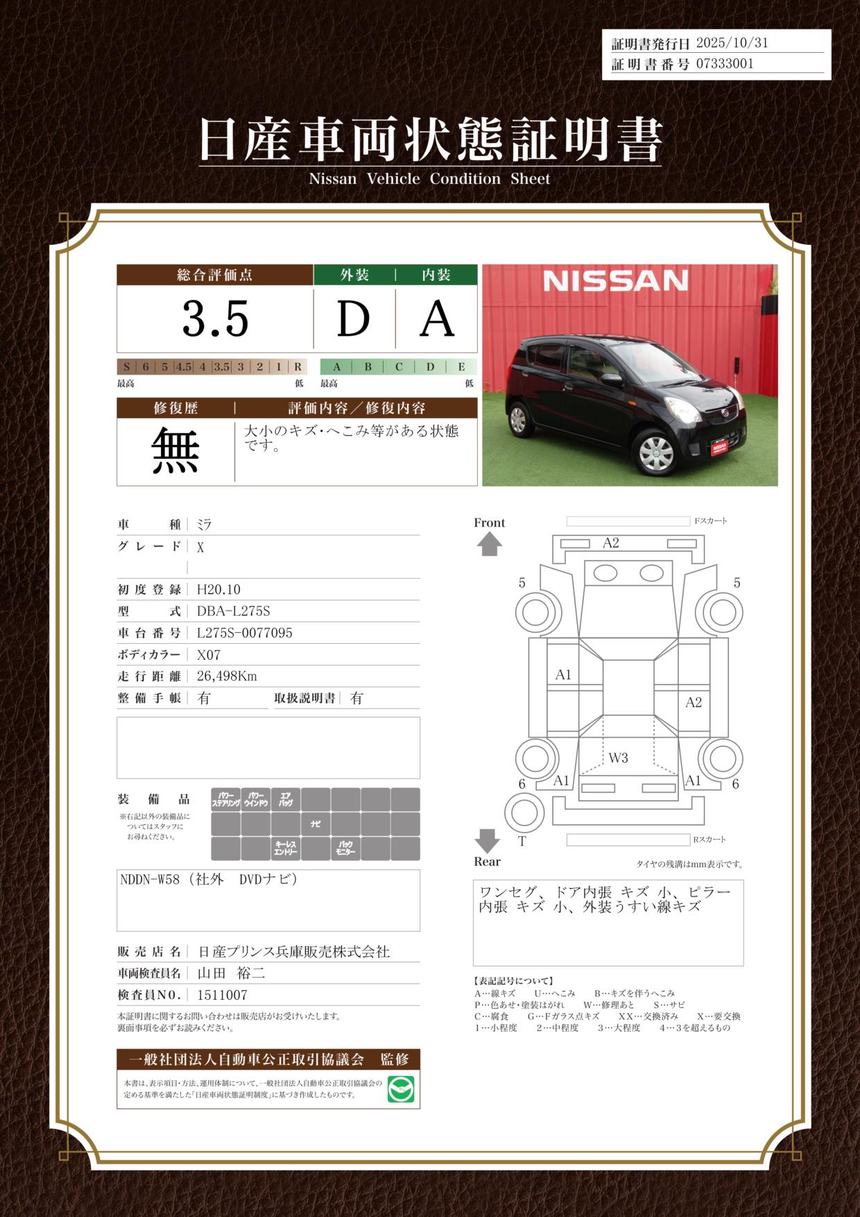 評価機関 : 日産車両状態証明