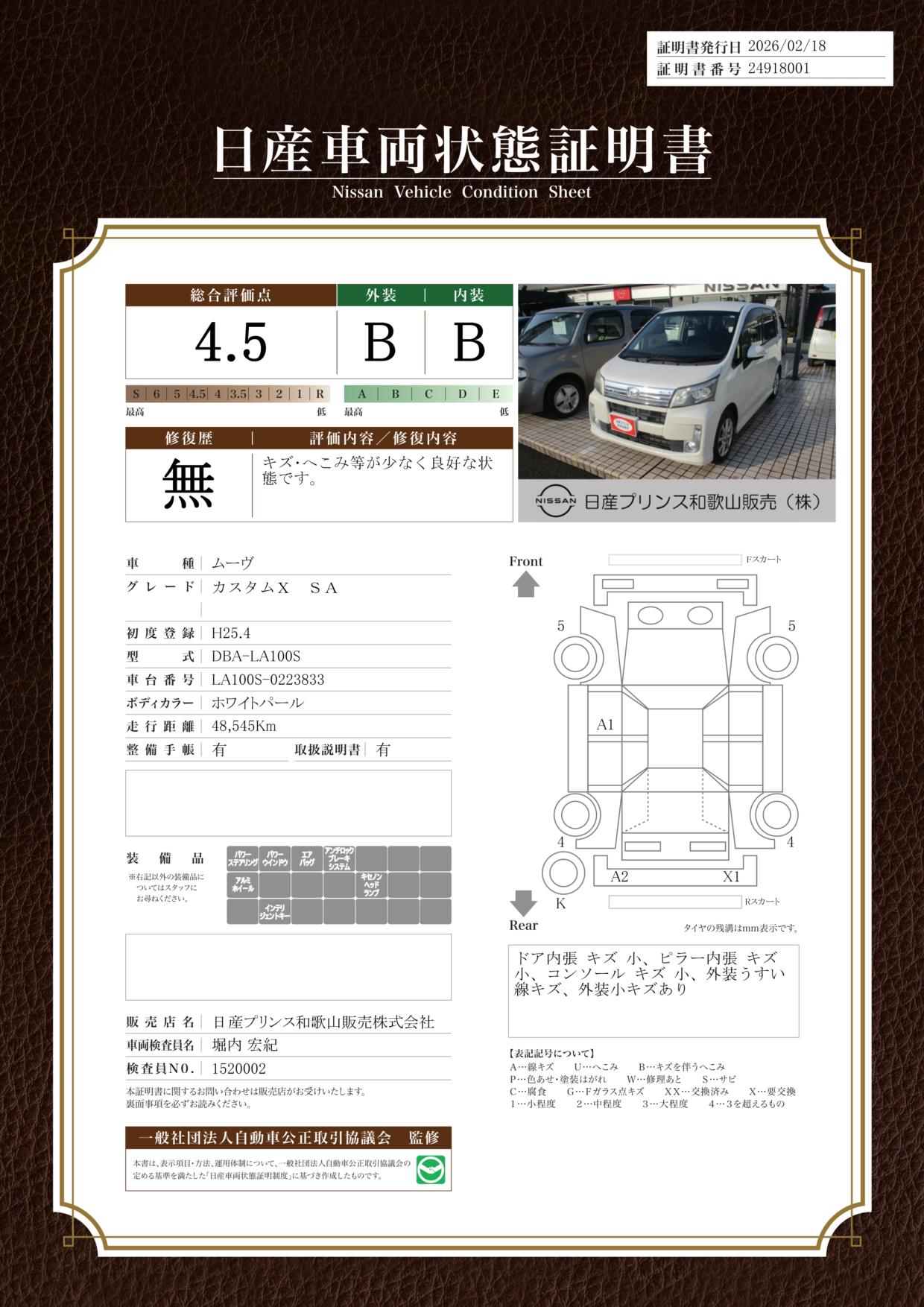 現状括弧書き内の年月まで車検有効期限が残っていますが、ご成約時に新しく車検を取り直します。なお取り直しの費用は車両価格に含まれています。