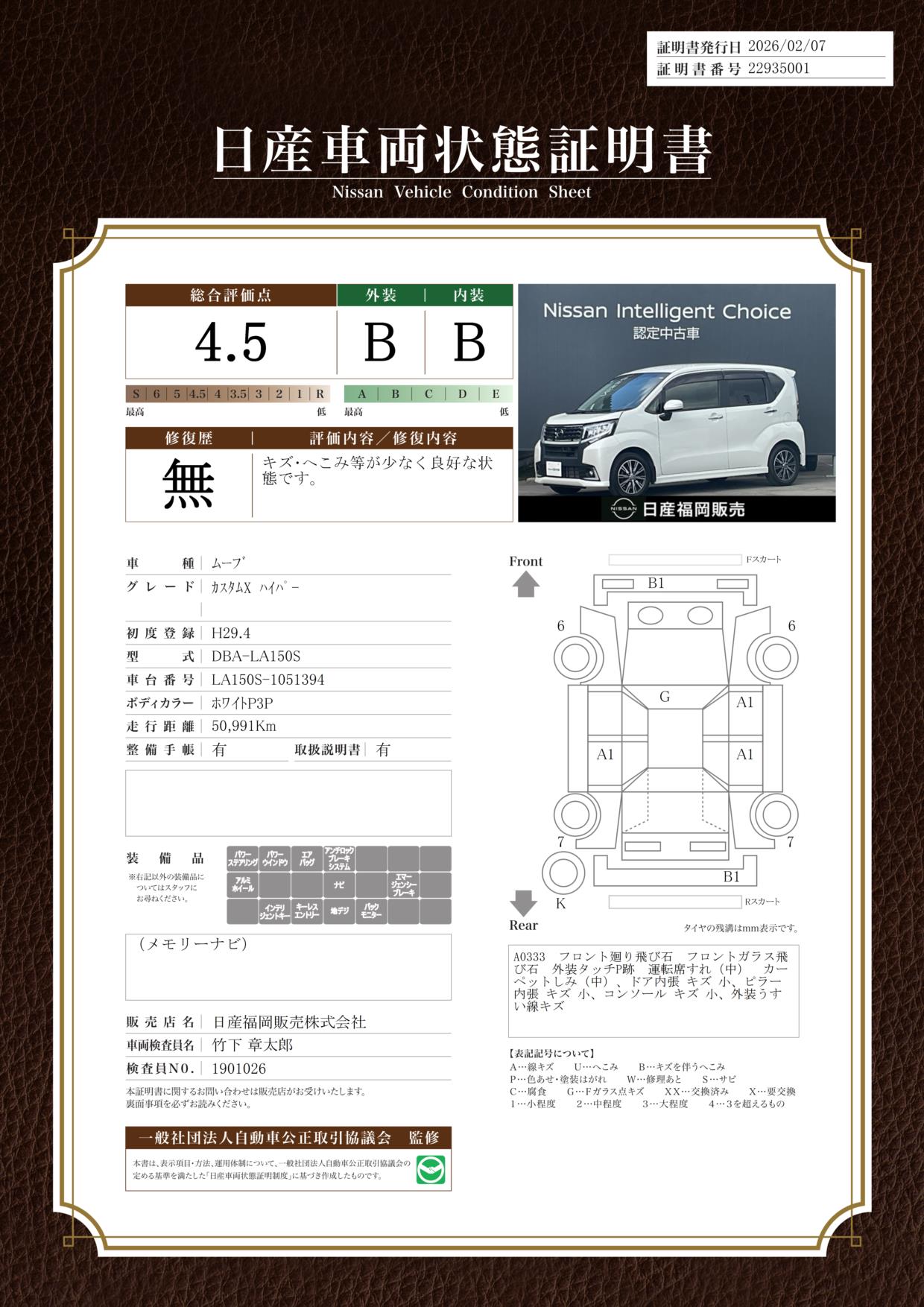 現状括弧書き内の年月まで車検有効期限が残っていますが、ご成約時に新しく車検を取り直します。なお取り直しの費用は車両価格に含まれています。