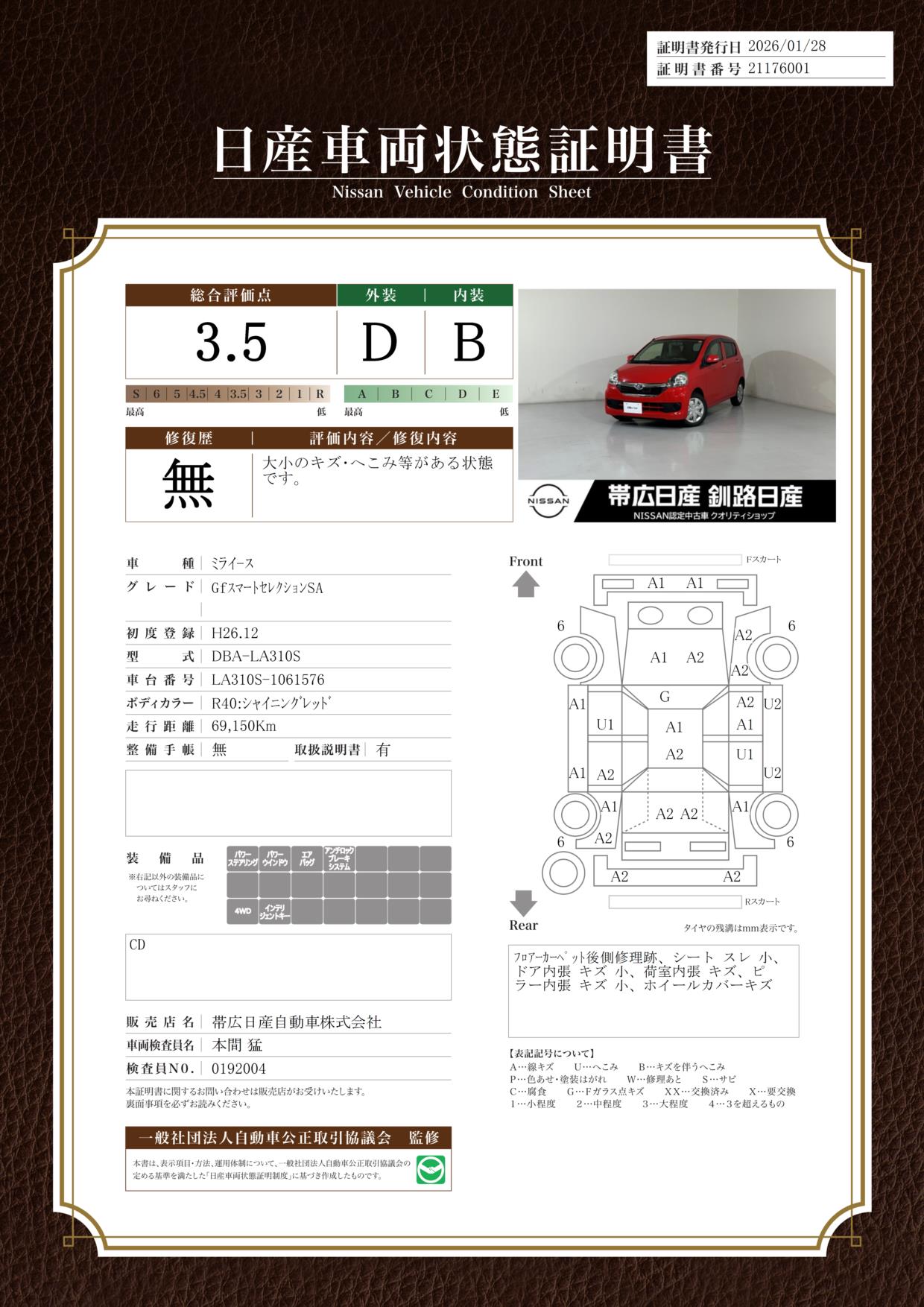 現状括弧書き内の年月まで車検有効期限が残っていますが、ご成約時に新しく車検を取り直します。なお取り直しの費用は車両価格に含まれています。