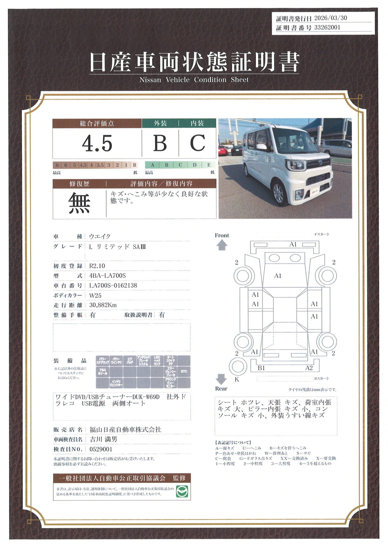 納車時に定期点検整備(費用は車両価格に含まれます。)
