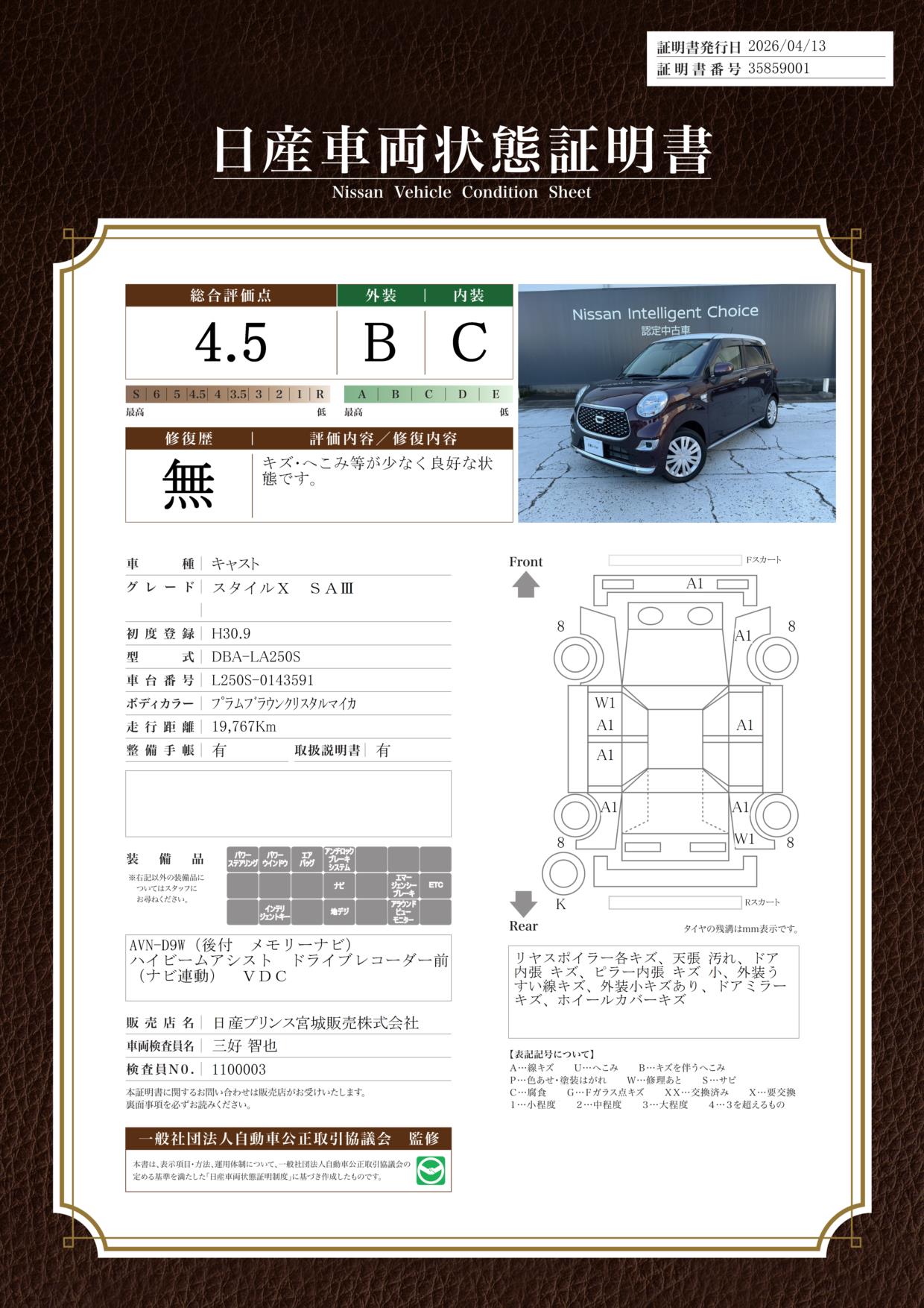 現状括弧書き内の年月まで車検有効期限が残っていますが、ご成約時に新しく車検を取り直します。なお取り直しの費用は車両価格に含まれています。