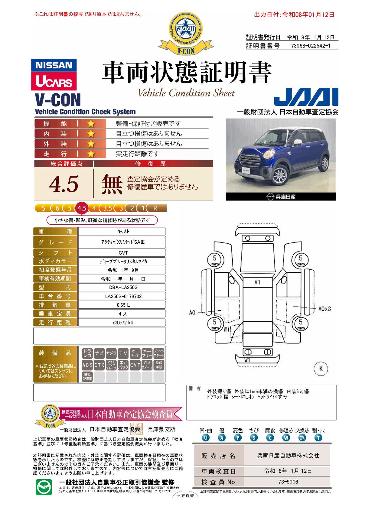 現状括弧書き内の年月まで車検有効期限が残っていますが、ご成約時に新しく車検を取り直します。なお取り直しの費用は車両価格に含まれています。