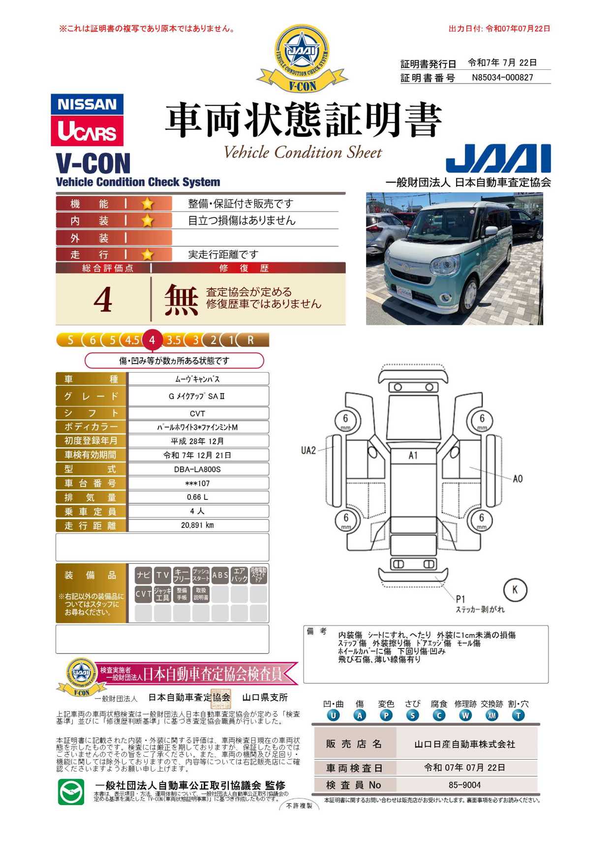 ムーヴキャンバス 660cc 660 G メイクアップ SAII 禁煙車 社外メモリーナビ
