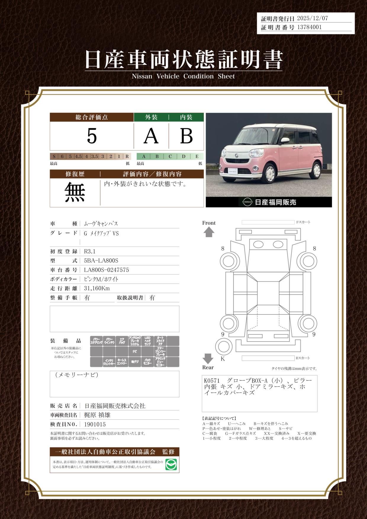 評価機関 : 日産車両状態証明