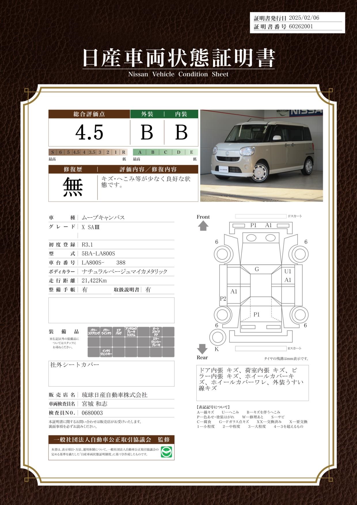 ★ダイハツ・ムーヴキャンバスXホワイトアクセントLTD-SAIII入庫【北谷展示】純正CD、両側パワースライドドア、純正シートカバー、新品ホワイトリボンタイヤ付【防錆施工済】