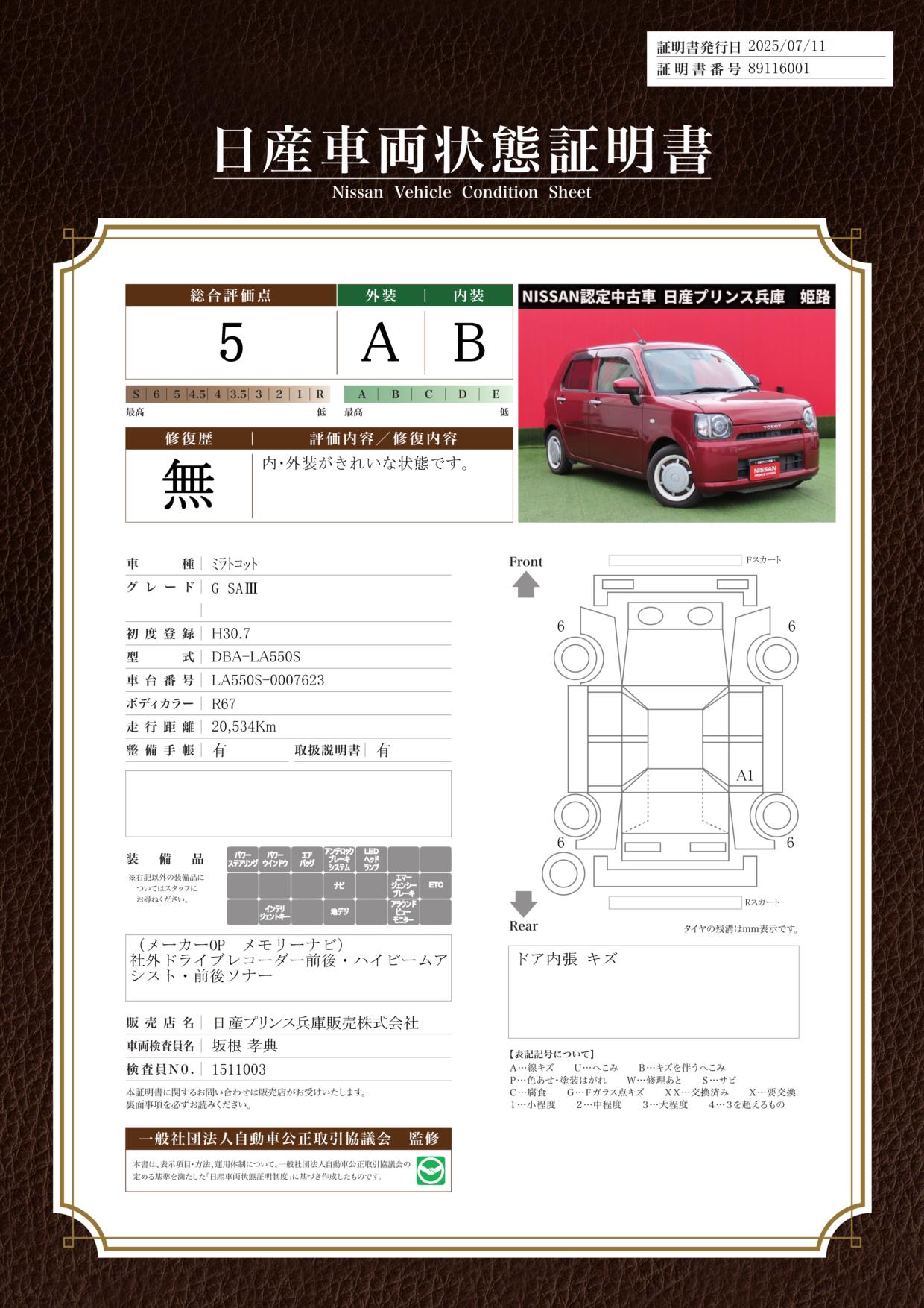 現状括弧書き内の年月まで車検有効期限が残っていますが、ご成約時に新しく車検を取り直します。なお取り直しの費用は車両価格に含まれています。