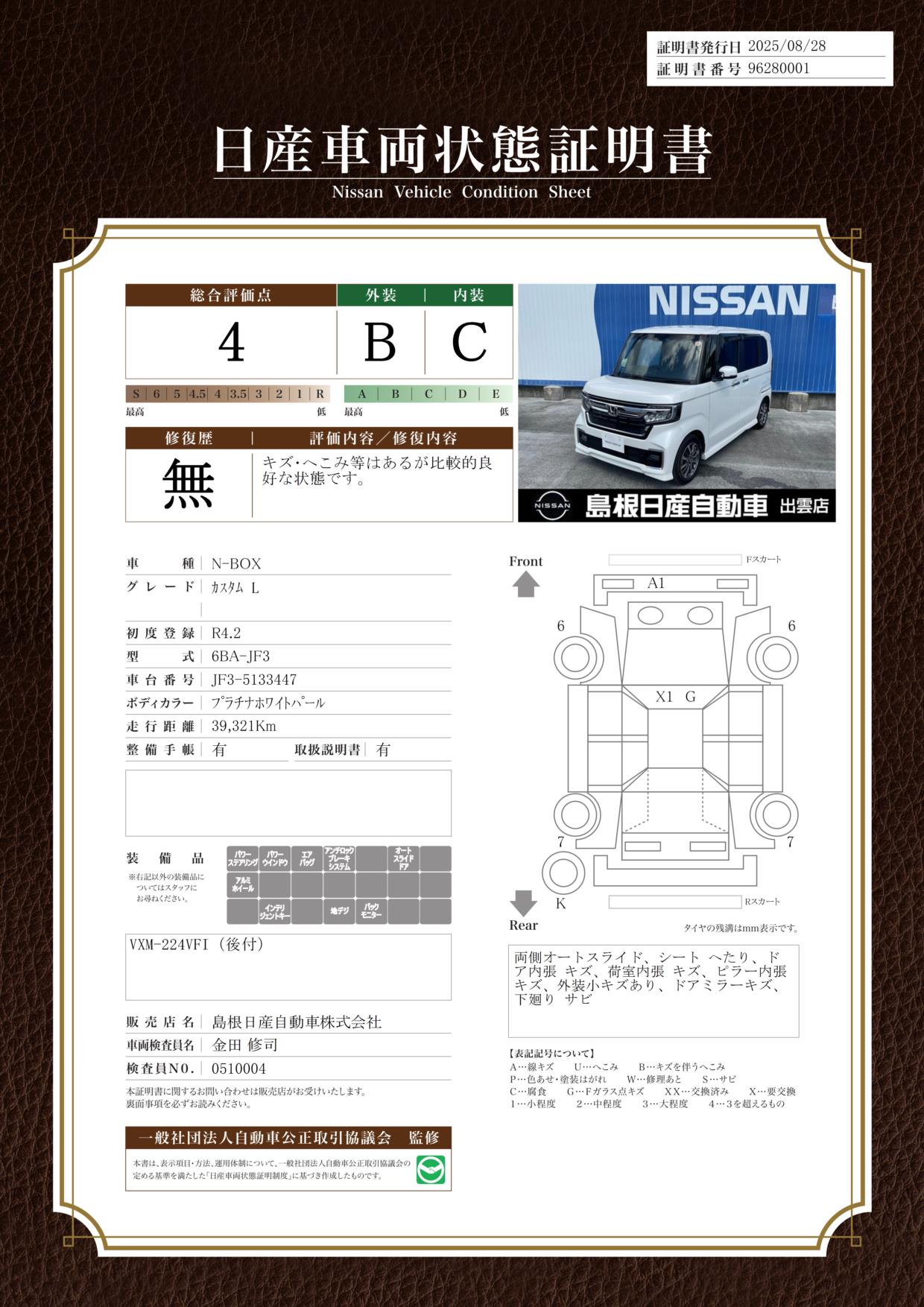 評価機関 : 日産車両状態証明