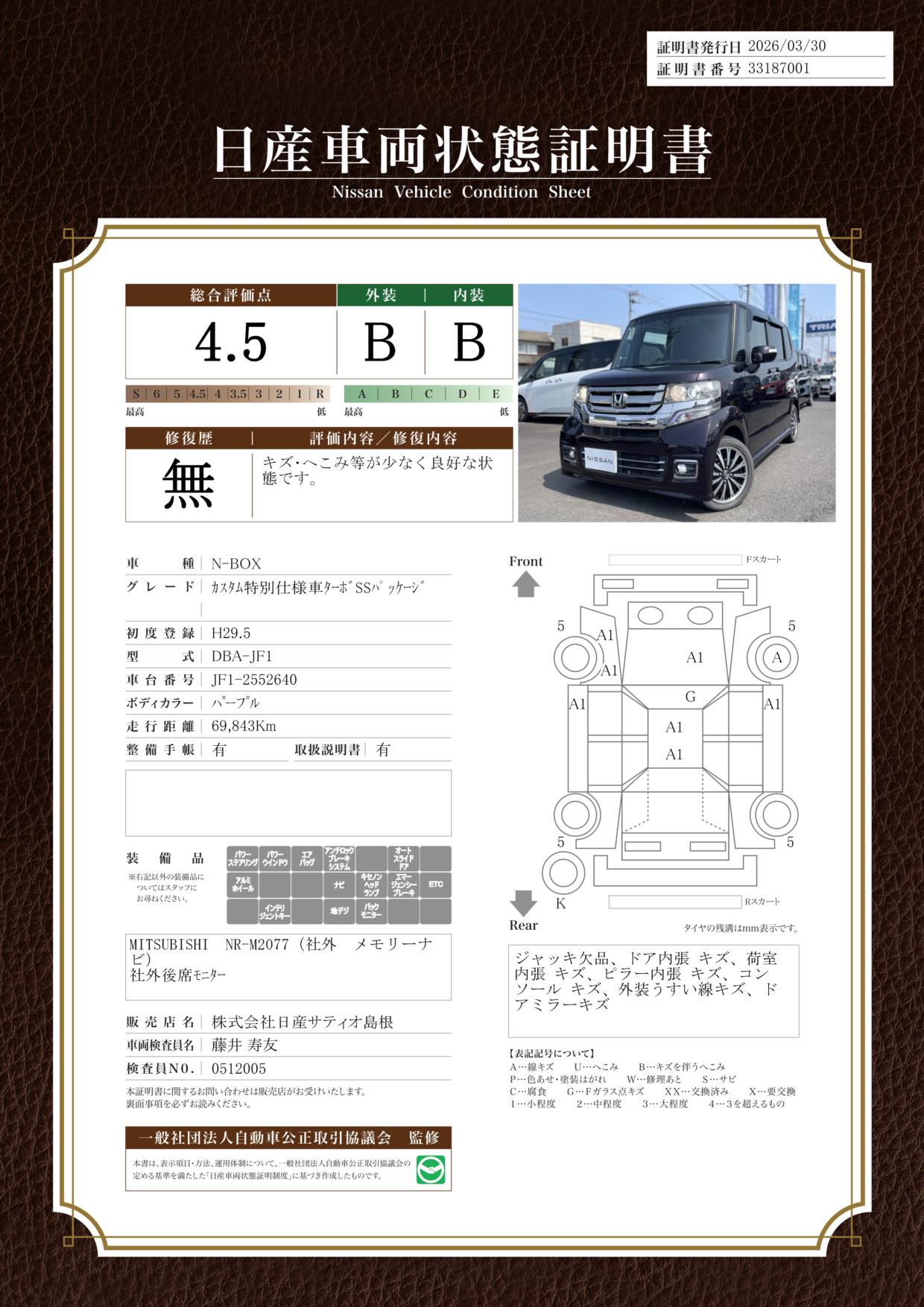 現状括弧書き内の年月まで車検有効期限が残っていますが、ご成約時に新しく車検を取り直します。なお取り直しの費用は車両価格に含まれています。