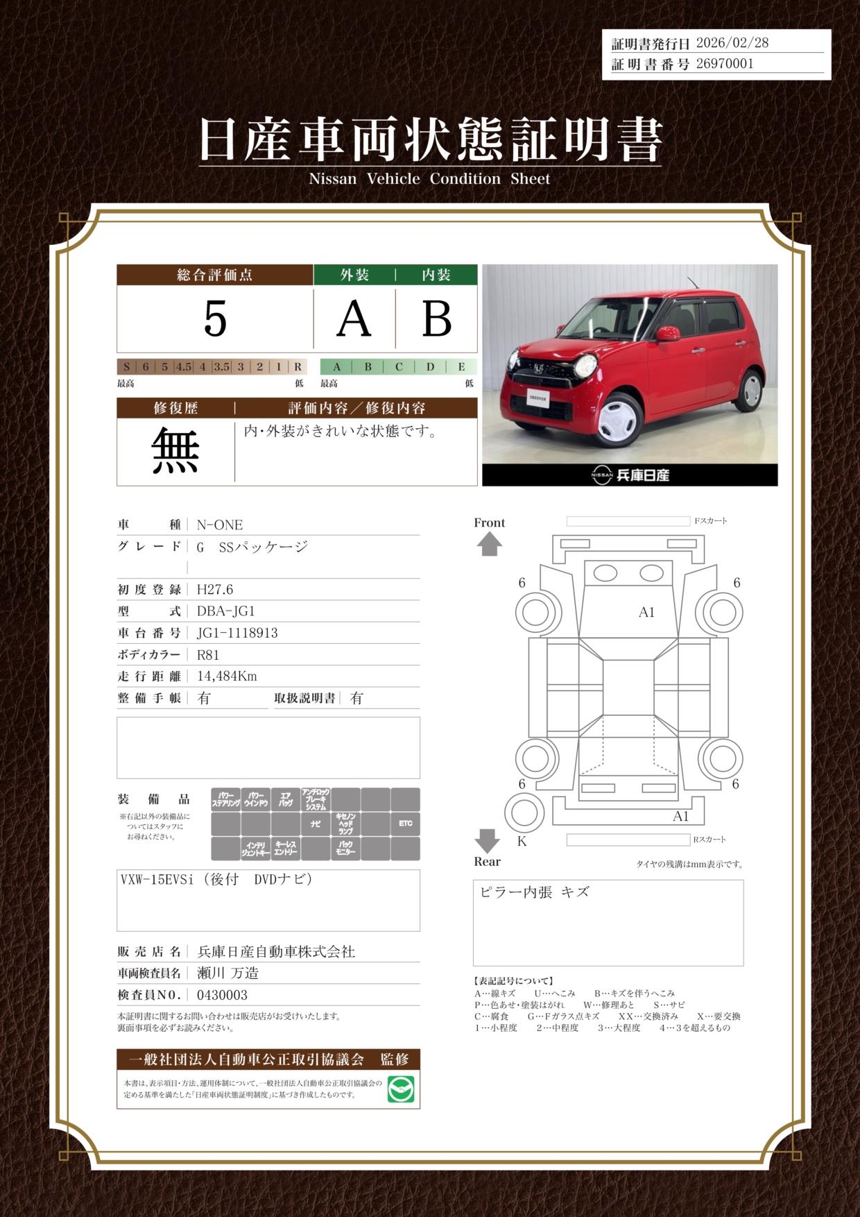 現状括弧書き内の年月まで車検有効期限が残っていますが、ご成約時に新しく車検を取り直します。なお取り直しの費用は車両価格に含まれています。