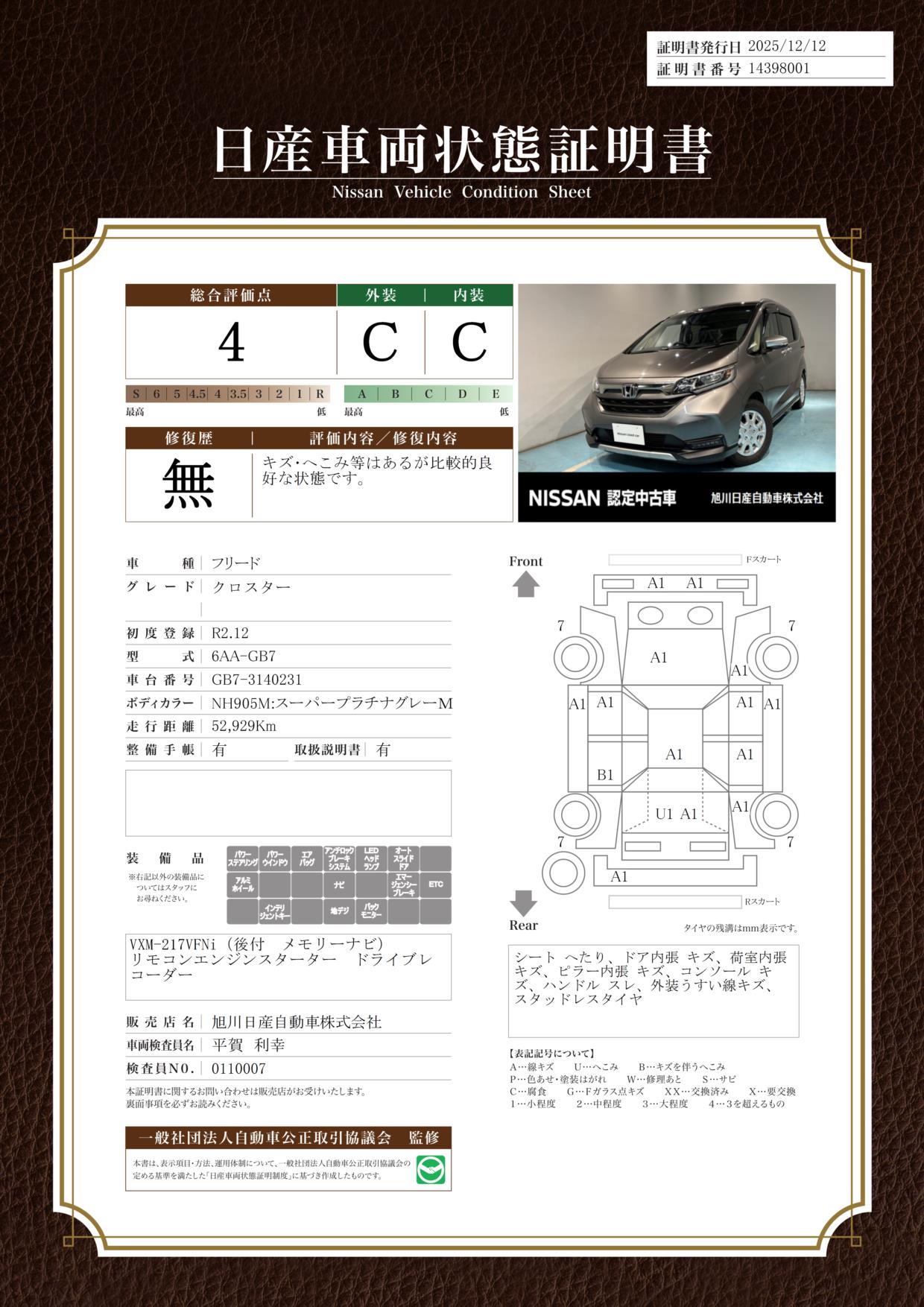 評価機関 : 日産車両状態証明