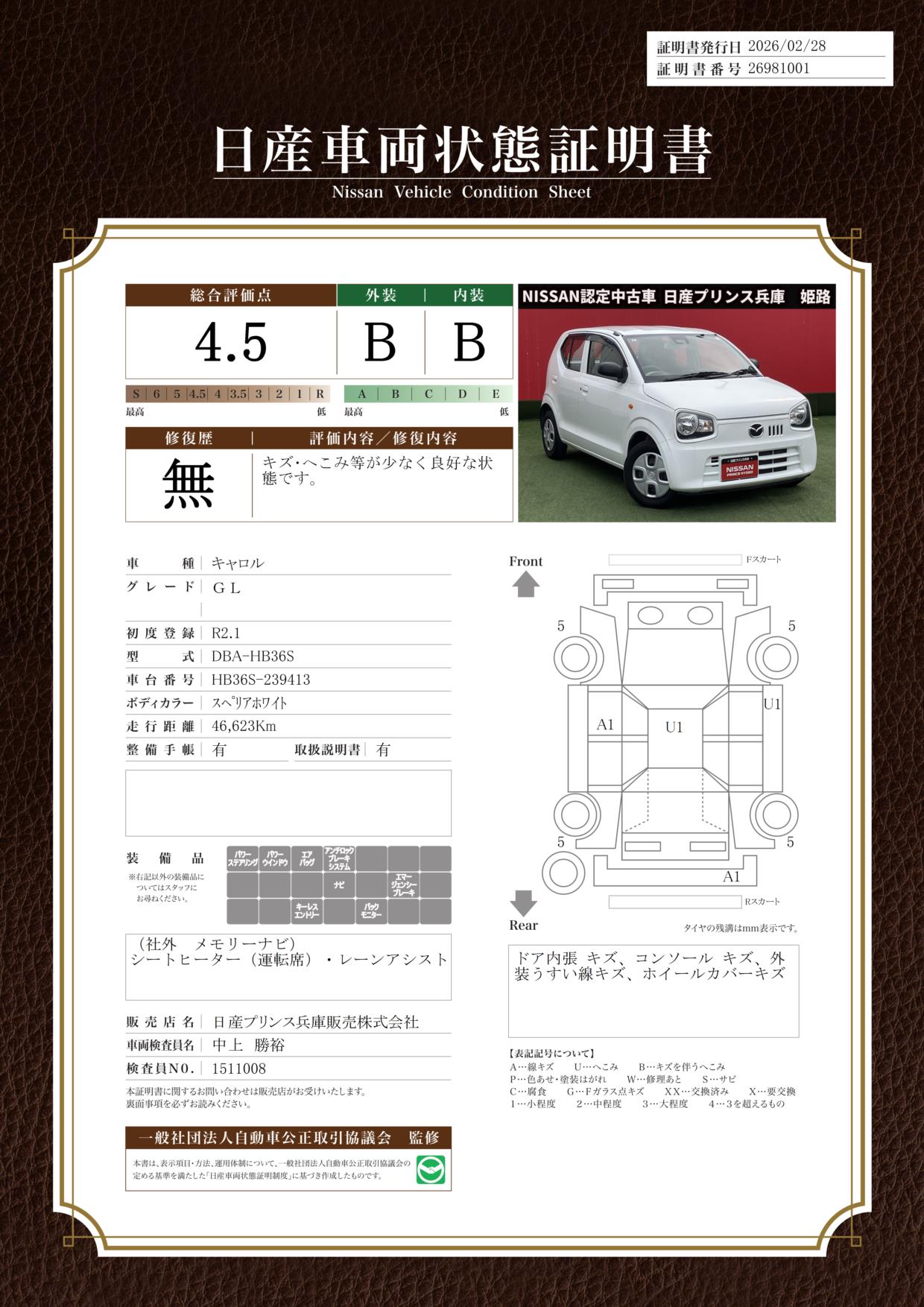 現状括弧書き内の年月まで車検有効期限が残っていますが、ご成約時に新しく車検を取り直します。なお取り直しの費用は車両価格に含まれています。