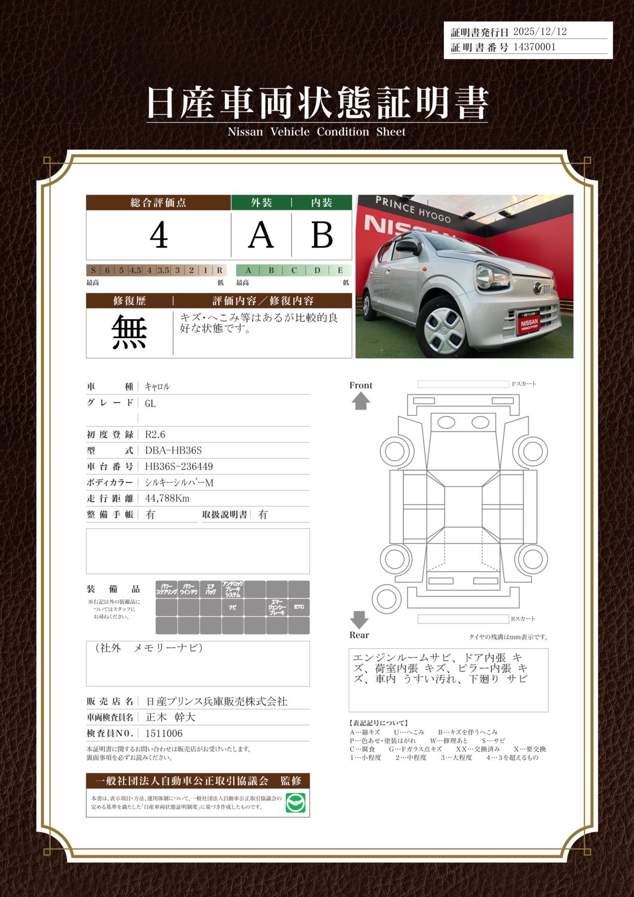 評価機関 : 日産車両状態証明