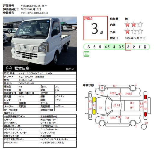 ★プロの目で厳選した質の高い車を展示しております★ ◇お客様が一番に喜んでいただけるようカーライフのサポートをさせていただきます◆ ★車種選び、ご購入、点検、車検、ご購入後の心配事など何でもご相談ください☆ ◇皆様のご来店をスタッフ一同お待ちしております。◆ ♪『保険も日産』 自動車保険も取り扱っております♪ -------------------------------- ◆当店へお越しの際は、高出交差点より松本方面に車で約10分! 国道19号線沿いツルヤ様隣の大きい松本日産の看板が目印です★