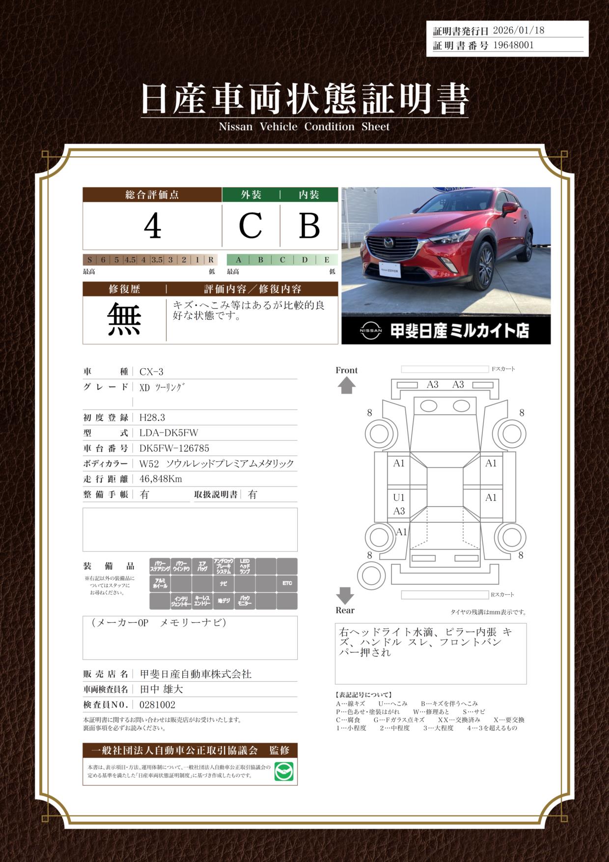 CX-3 1500cc 1.5 XD ツーリング ディーゼルターボ クルーズコントロール/衝突軽減ブレーキ/障