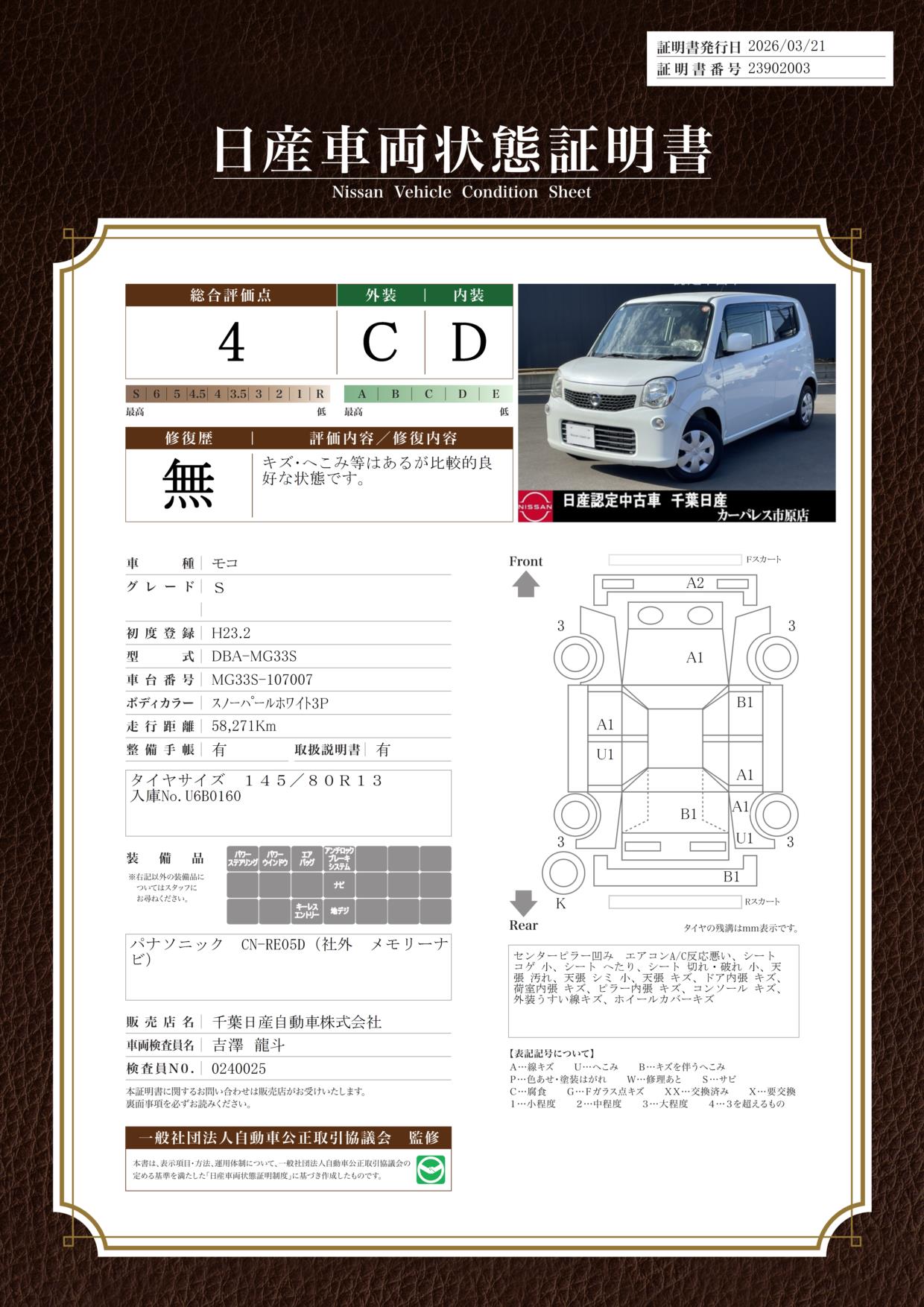 現状括弧書き内の年月まで車検有効期限が残っていますが、ご成約時に新しく車検を取り直します。なお取り直しの費用は車両価格に含まれています。