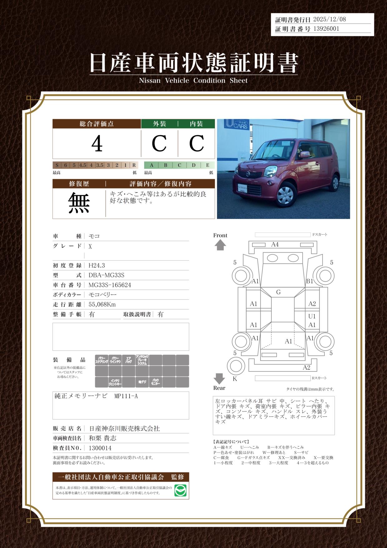 評価機関 : 日産車両状態証明