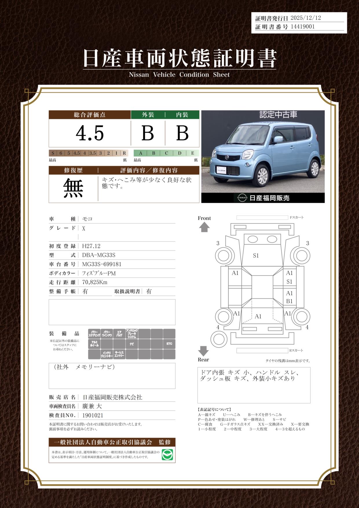 現状括弧書き内の年月まで車検有効期限が残っていますが、ご成約時に新しく車検を取り直します。なお取り直しの費用は車両価格に含まれています。