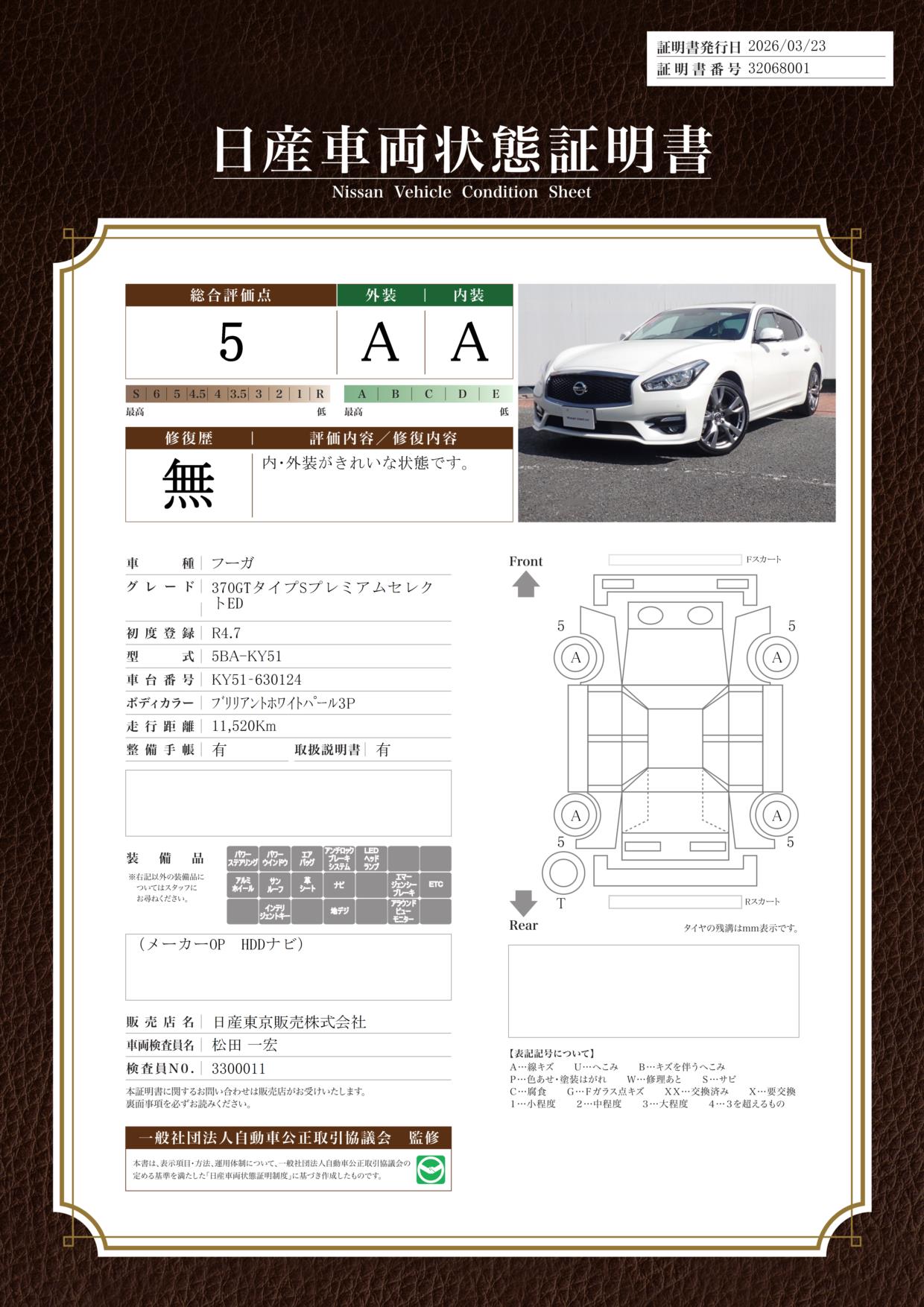 「車両状態証明書」は、査定協会監修のプロの検査員が公正かつ確かな基準で検査した”安心の証”です。