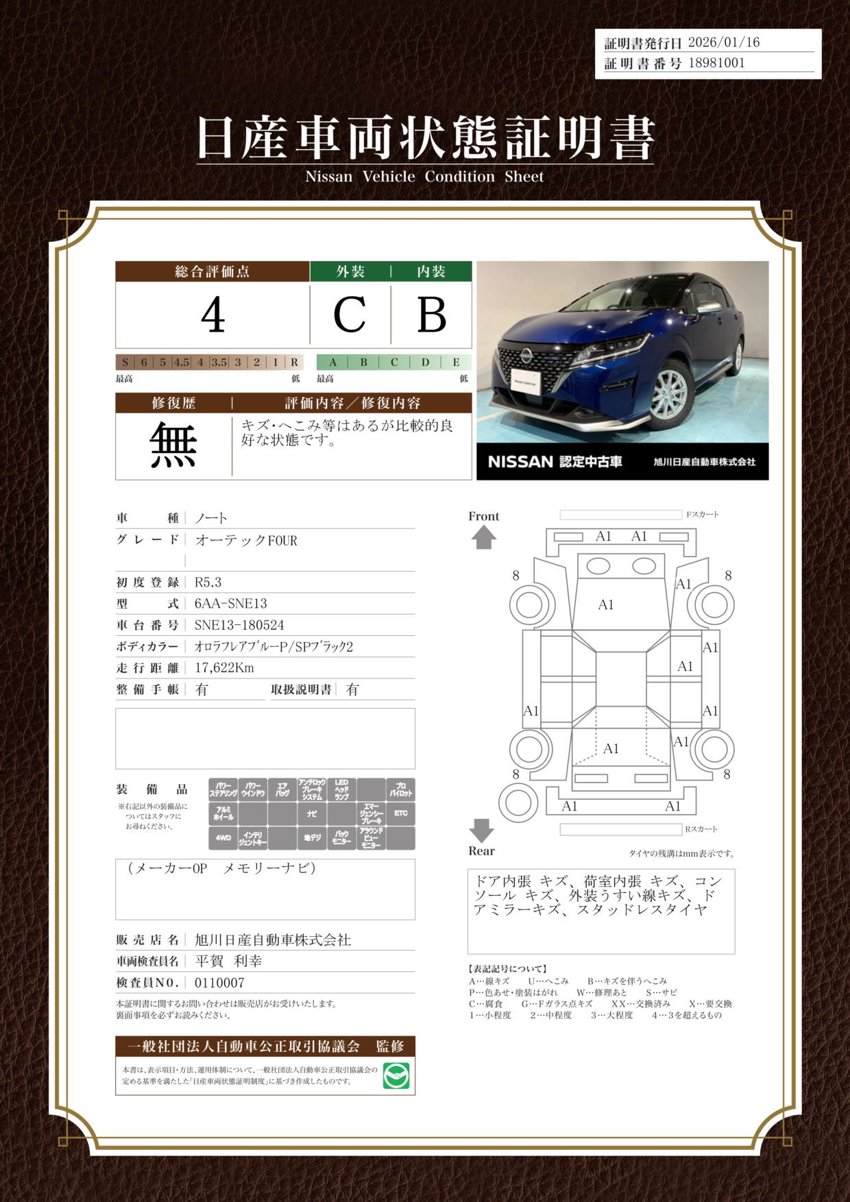 現状括弧書き内の年月まで車検有効期限が残っていますが、ご成約時に新しく車検を取り直します。なお取り直しの費用は車両価格に含まれています。