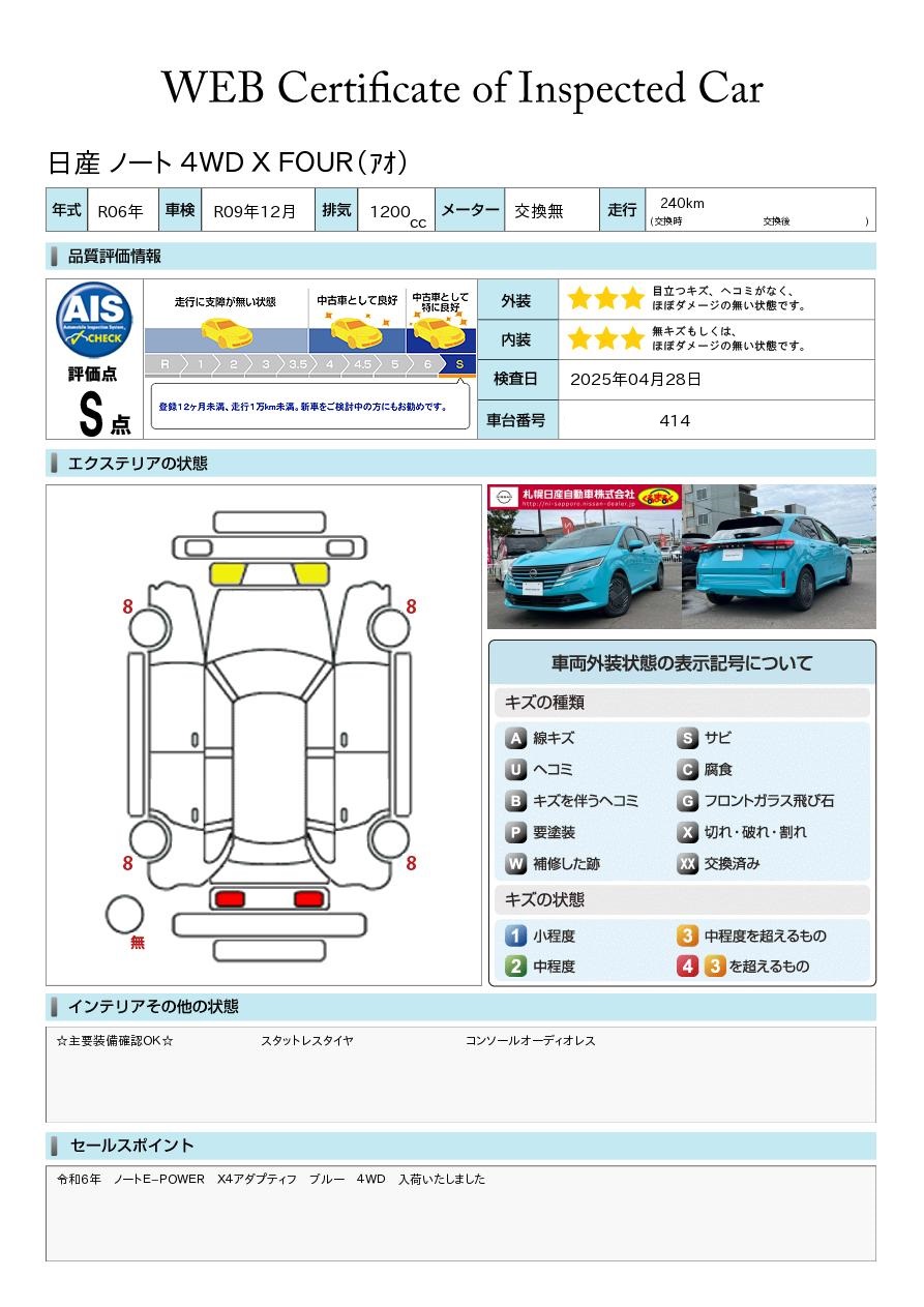 令和6年 ノートE-POWER X4アダプティフ ブルー 4WD 入荷いたしました当社試乗車UP ステアリングヒーター 全席シートヒーター