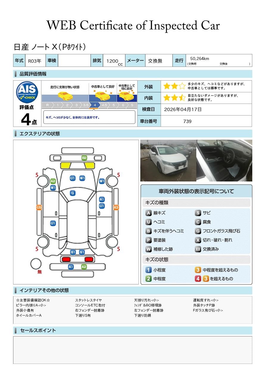 現状括弧書き内の年月まで車検有効期限が残っていますが、ご成約時に新しく車検を取り直します。なお取り直しの費用は車両価格に含まれています。