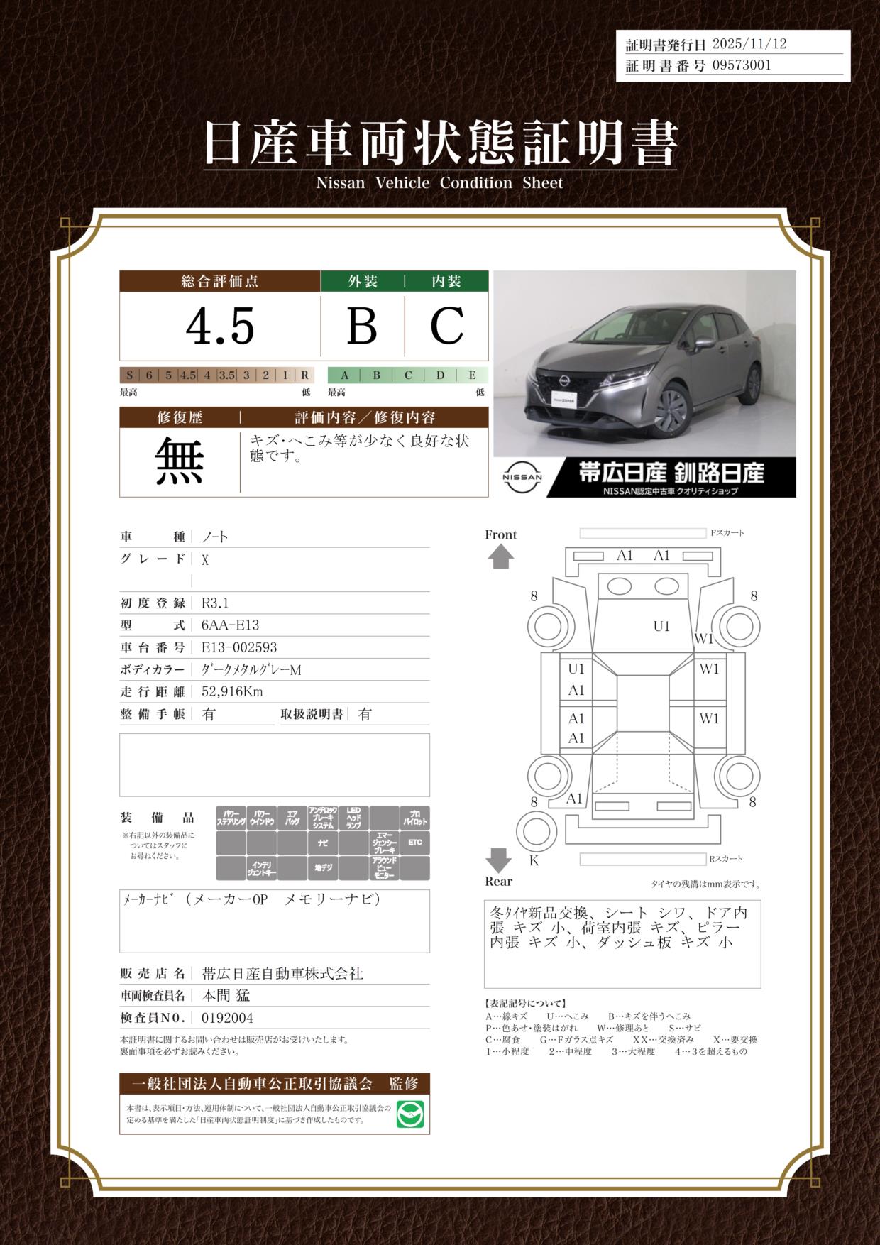 日産認定中古車│キズやへこみが少ないグレーのノートが入庫しました!ステアリングヒーターシートヒーターアラウンドBモニター横滑り防止装置定期点検記録簿