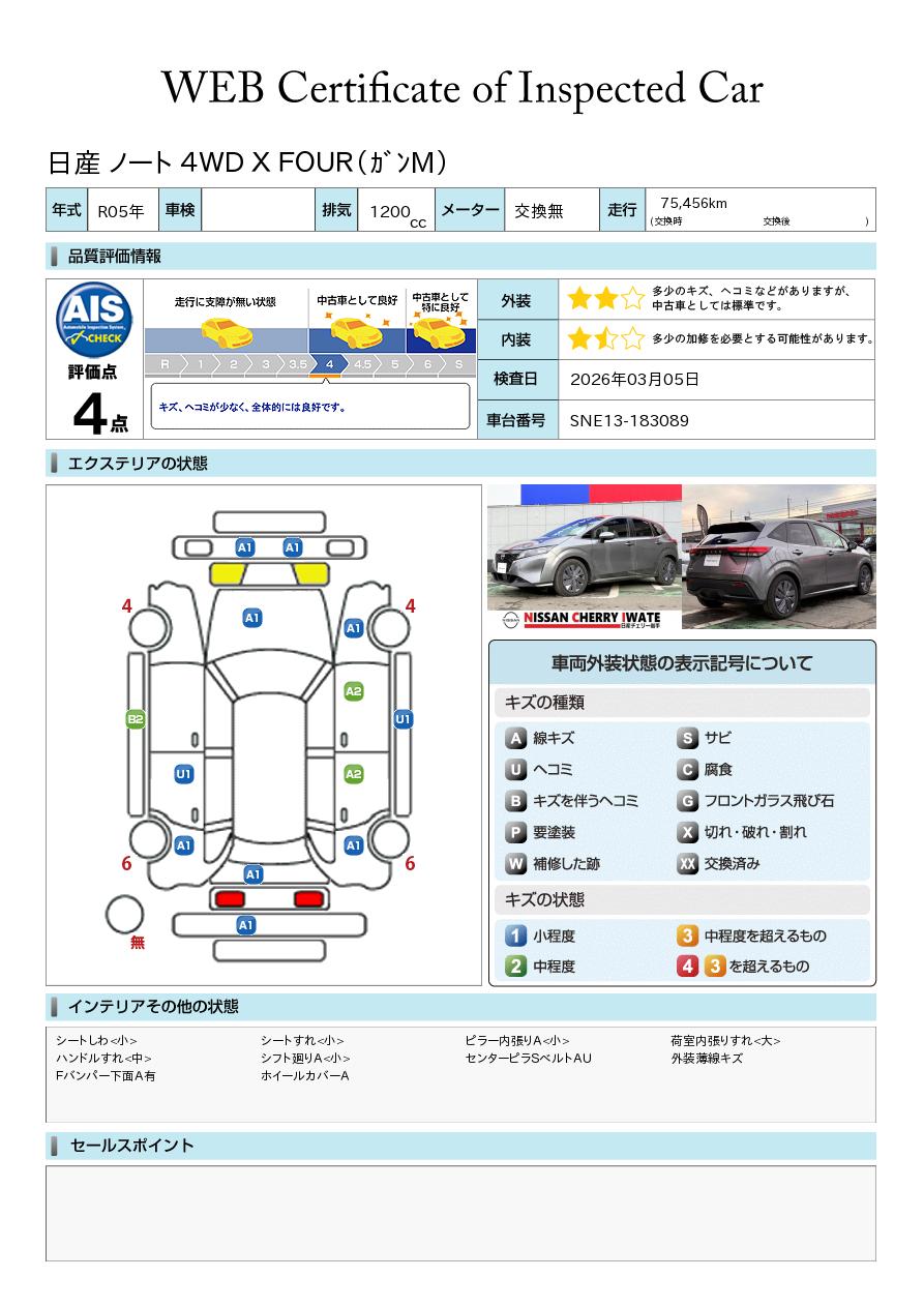 ノート 1200cc 1.2 X FOUR スマートセーフティエディション 4WD 純正ナビ アラウンドビューモニター