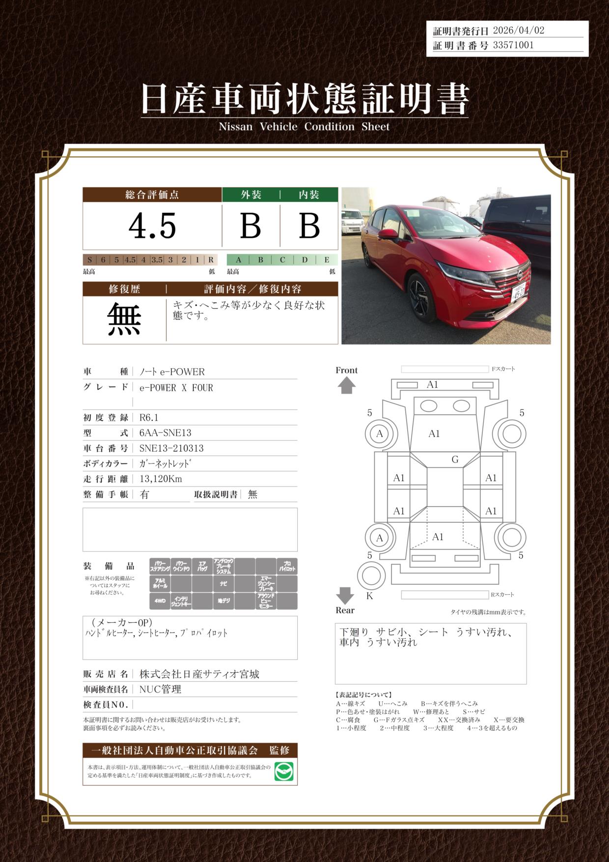 「車両状態証明書」は、査定協会監修のプロの検査員が公正かつ確かな基準で検査した”安心の証”です。