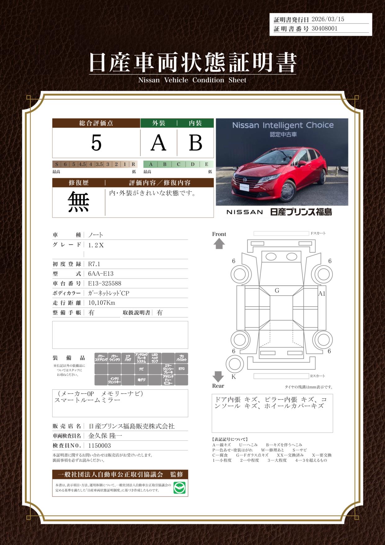 「車両状態証明書」は、査定協会監修のプロの検査員が公正かつ確かな基準で検査した”安心の証”です。