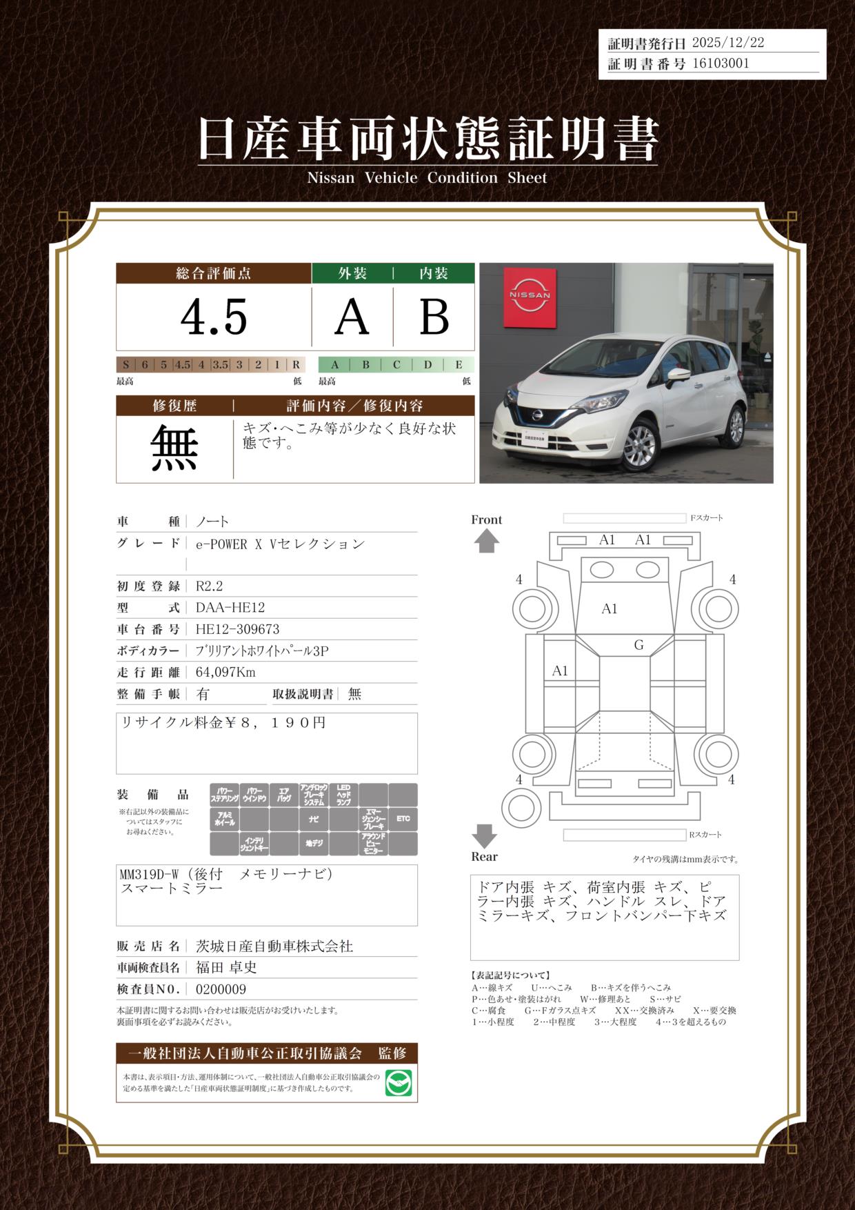 評価機関 : 日産車両状態証明