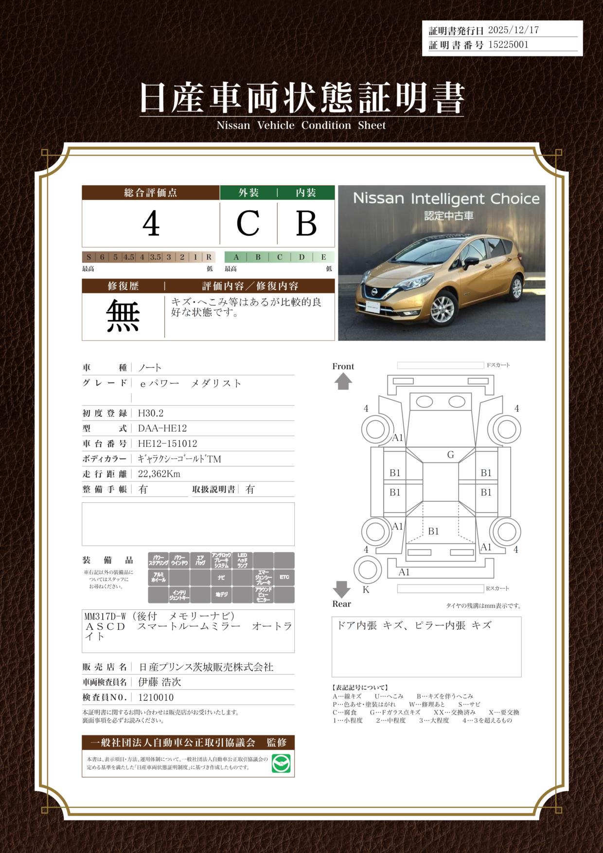 ノート 1200cc 1.2 e-POWER メダリスト 1年保証付き 純正ナビ バックカメラ