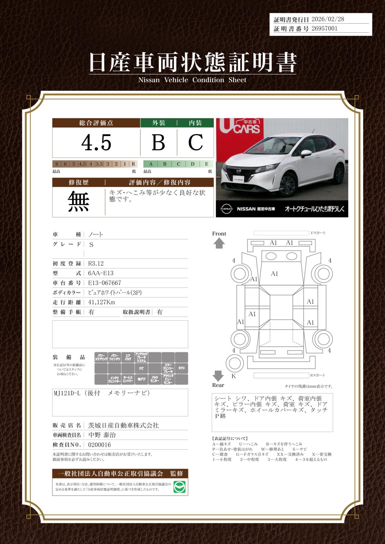 現状括弧書き内の年月まで車検有効期限が残っていますが、ご成約時に新しく車検を取り直します。なお取り直しの費用は車両価格に含まれています。