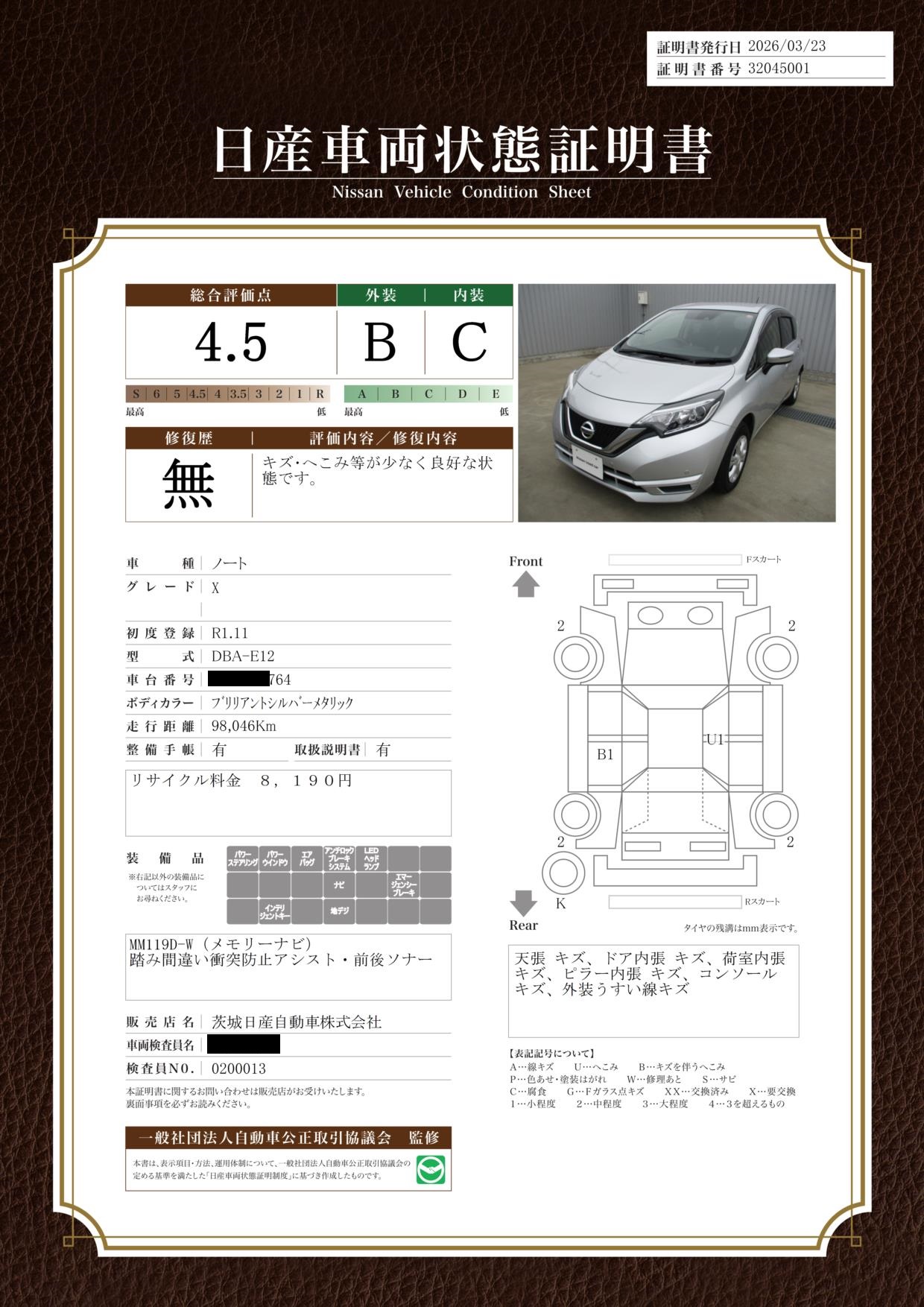 現状括弧書き内の年月まで車検有効期限が残っていますが、ご成約時に新しく車検を取り直します。なお取り直しの費用は車両価格に含まれています。
