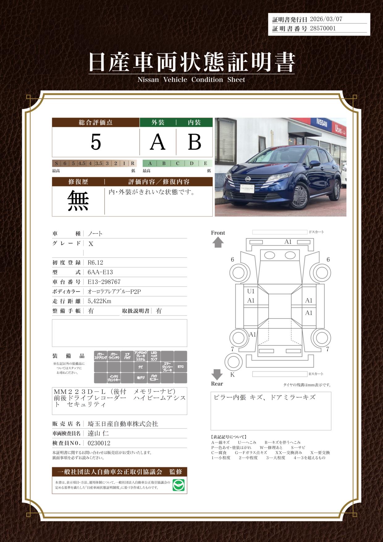 「車両状態証明書」は、査定協会監修のプロの検査員が公正かつ確かな基準で検査した”安心の証”です。
