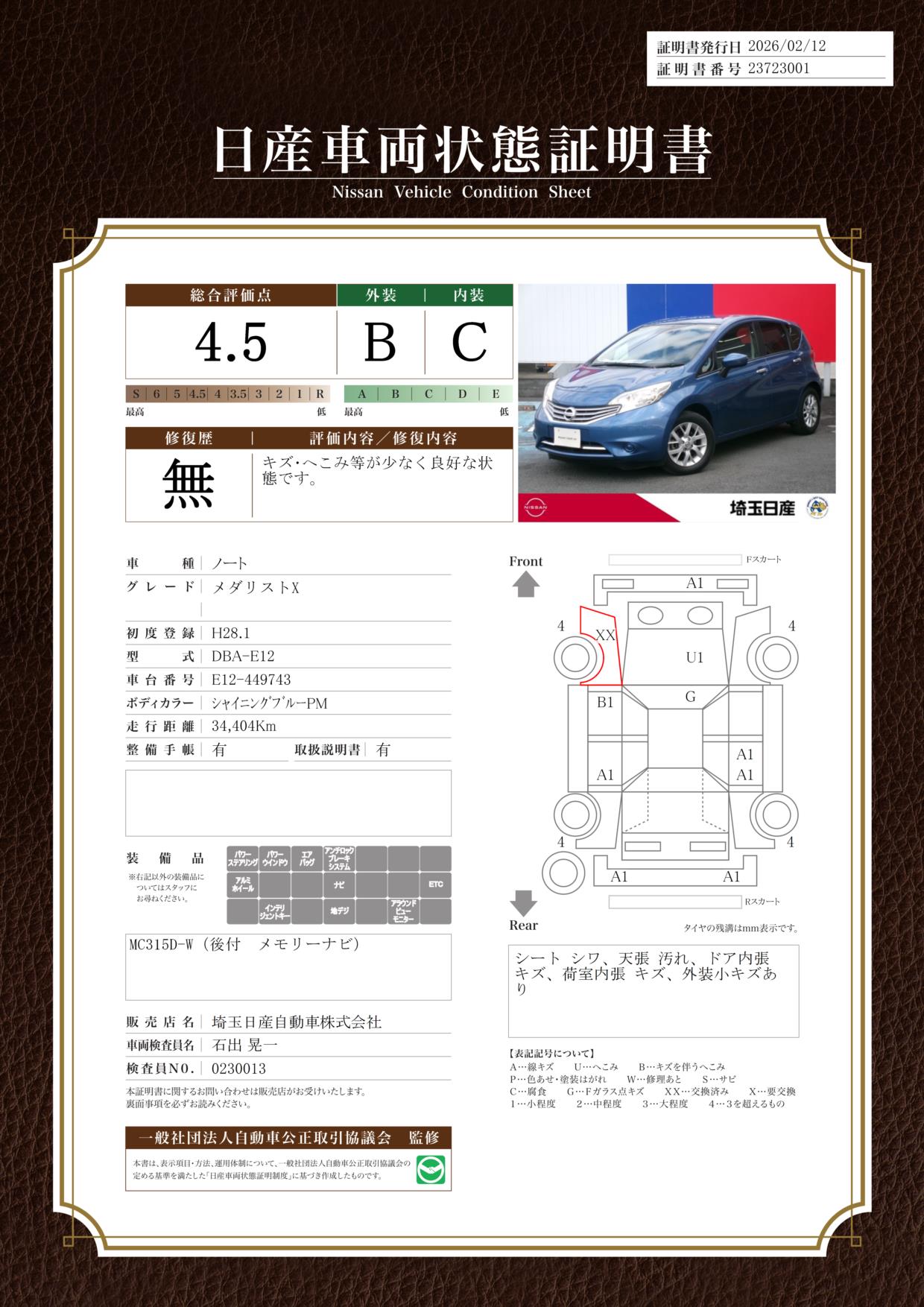 現状括弧書き内の年月まで車検有効期限が残っていますが、ご成約時に新しく車検を取り直します。なお取り直しの費用は車両価格に含まれています。