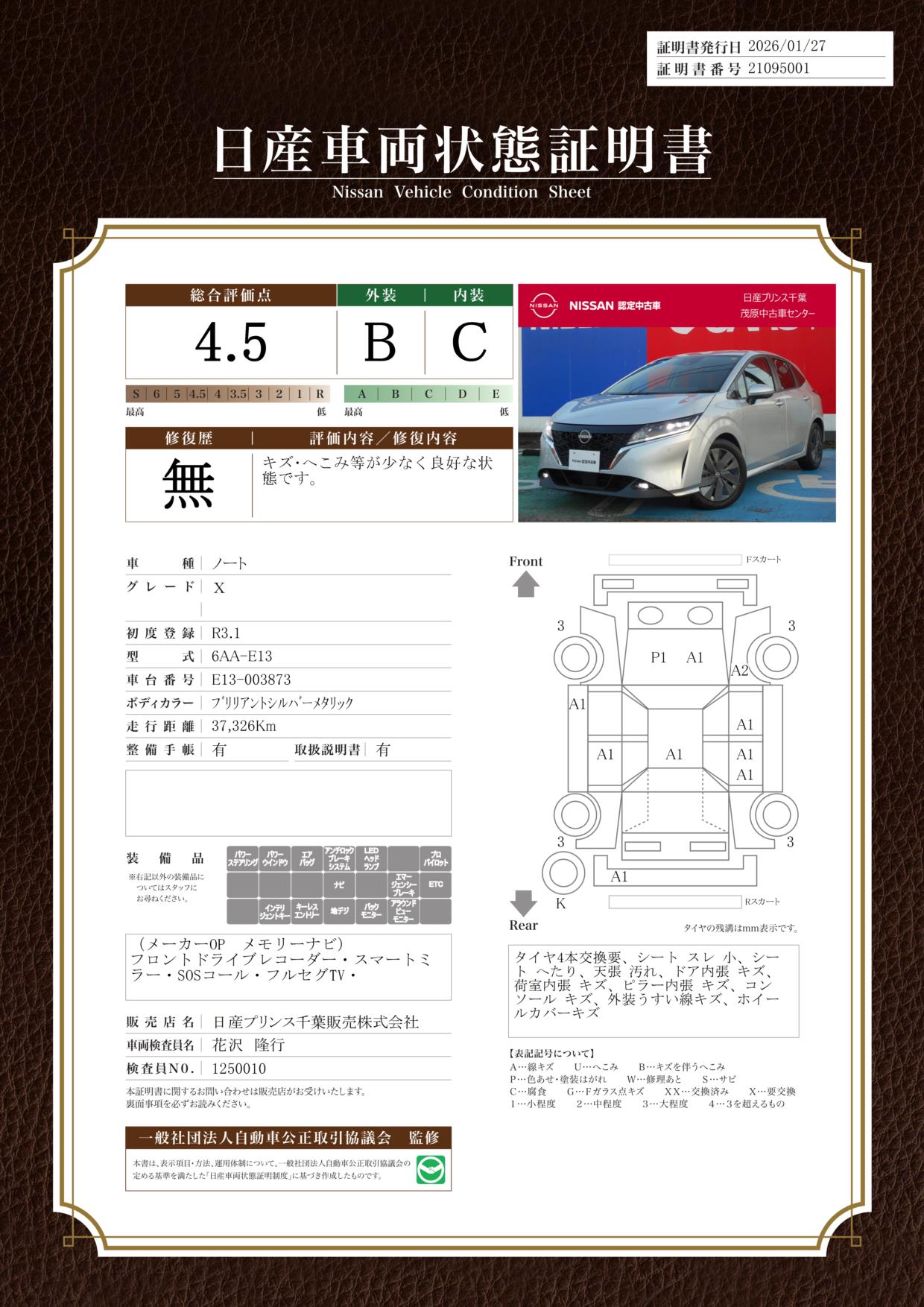 現状括弧書き内の年月まで車検有効期限が残っていますが、ご成約時に新しく車検を取り直します。なお取り直しの費用は車両価格に含まれています。