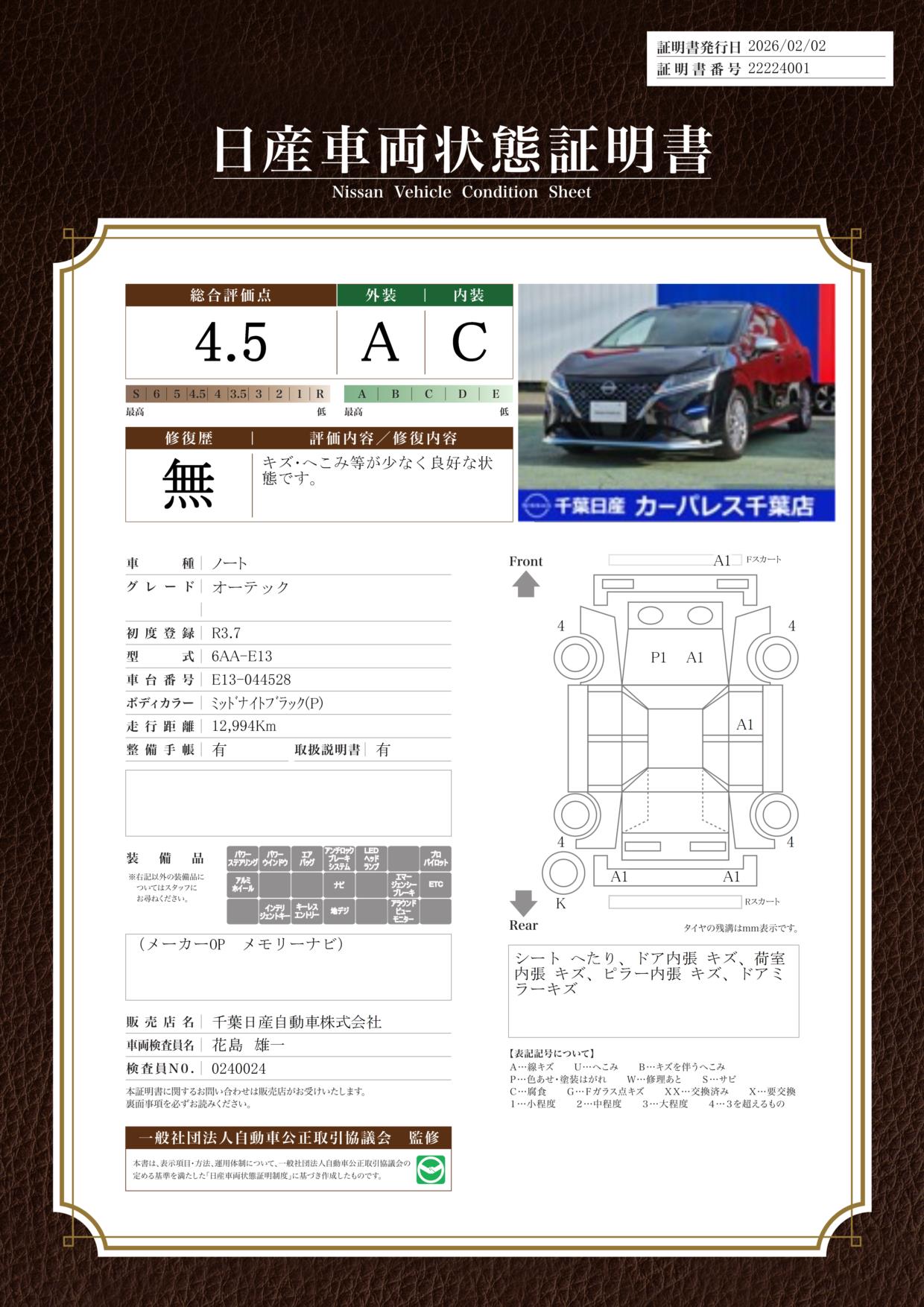 評価機関 : 日産車両状態証明