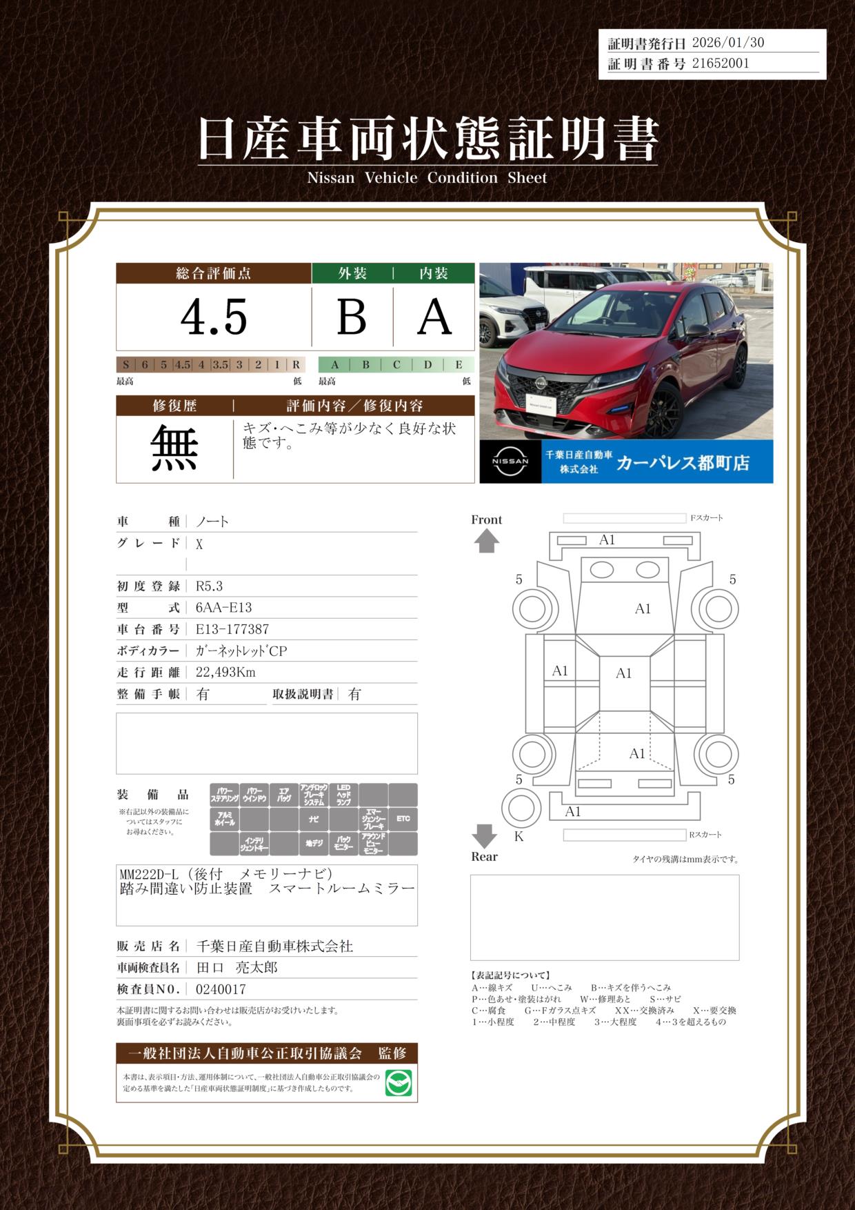 ●日産認定のクオリティショップです。日産プレミアム認定中古車、日産認定中古車、日産電動車を中心とした高品質な中古車を展示しております。 ●日産の中古車無料保証「ワイド保証」つきで安心です。他社の保証内容とぜひ見比べてください。 ●国道126号線沿いでアクセス抜群です。 ●キッズスペースもございますのでお子様連れでも安心です。 ●最寄り駅: JR千葉駅 ※公共交通機関でご来場のお客様はお声がけください。お迎えにあがります。 ●リモート商談も可能です。