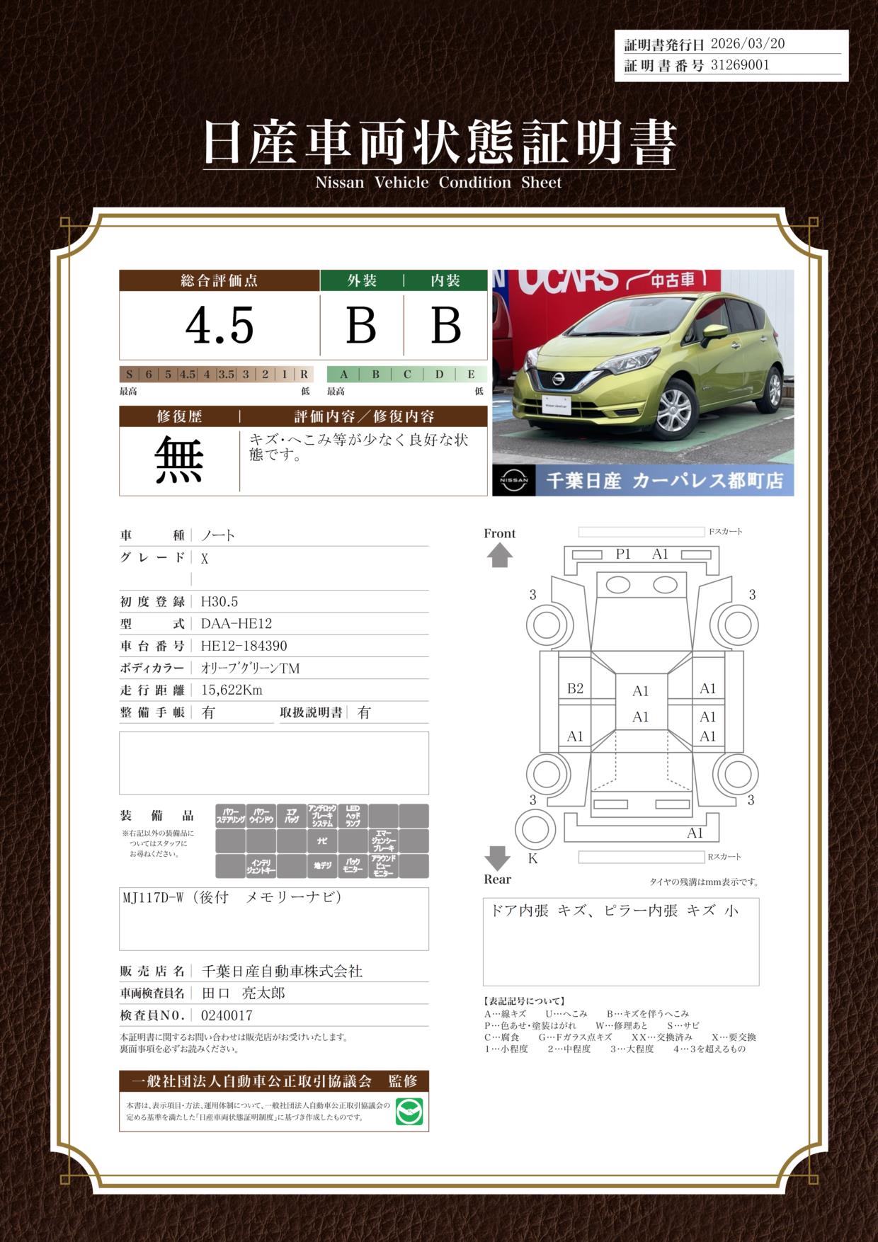 ●日産認定のクオリティショップです。日産プレミアム認定中古車、日産認定中古車、日産電動車を中心とした高品質な中古車を展示しております。 ●日産の中古車無料保証「ワイド保証」つきで安心です。他社の保証内容とぜひ見比べてください。 ●国道126号線沿いでアクセス抜群です。 ●キッズスペースもございますのでお子様連れでも安心です。 ●最寄り駅: JR千葉駅 ※公共交通機関でご来場のお客様はお声がけください。お迎えにあがります。 ●リモート商談も可能です。