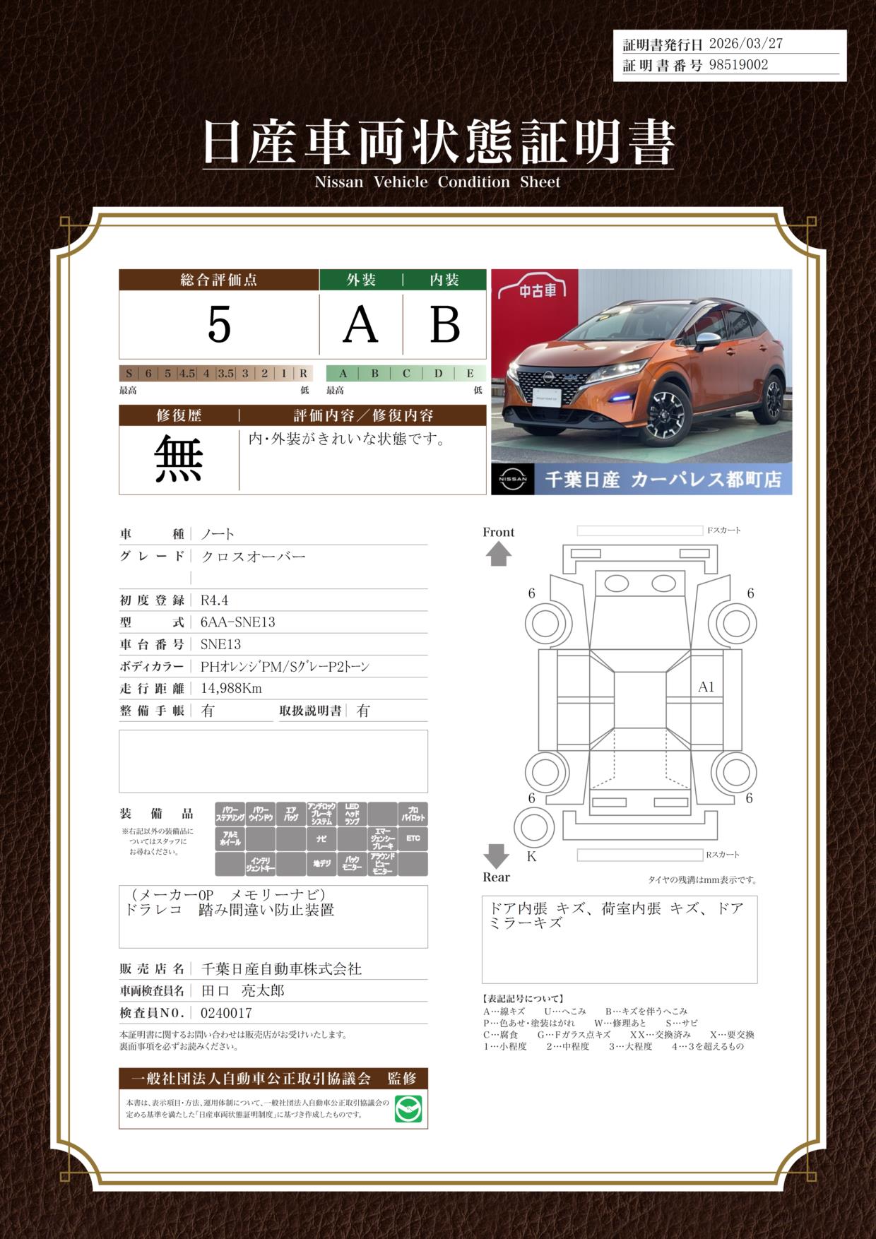 現状括弧書き内の年月まで車検有効期限が残っていますが、ご成約時に新しく車検を取り直します。なお取り直しの費用は車両価格に含まれています。