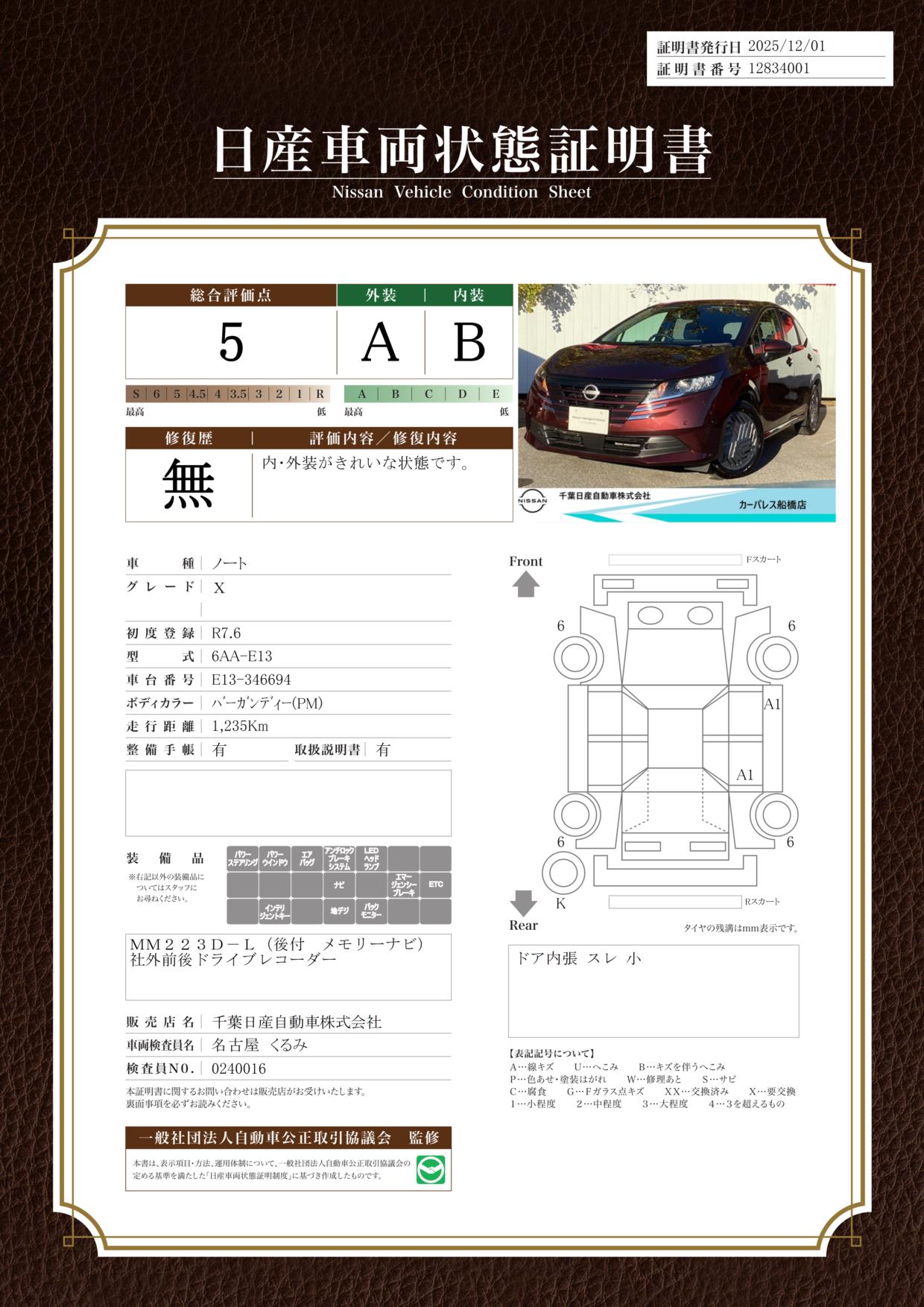 評価機関 : 日産車両状態証明