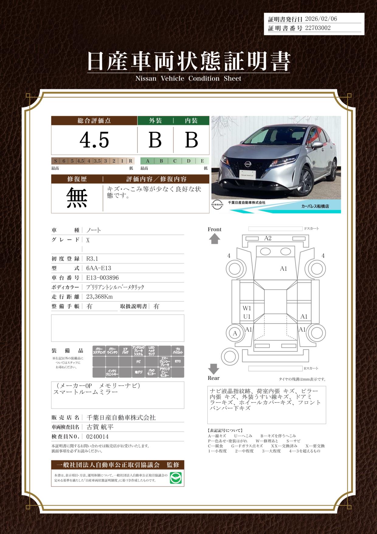 ●展示可能台数100台以上の大規模展示場で、千葉日産・日産プリンス千葉の在庫を一度にご覧いただける2社合同の中古車店舗です。 ●日産プレミアム認定中古車、日産認定中古車、日産電動車を中心とした高品質な中古車をご覧ください。 ●日産の中古車無料保証「ワイド保証」つきで安心です。他社の保証内容とぜひ見比べてください。 ●店内にはキッズスペースもございますのでお子様連れでも安心です。 ●船取県道(県道8号船橋我孫子線)沿いのお店です。 ●公共交通機関でご来場のお客様はお声がけください。お迎えにあがります。